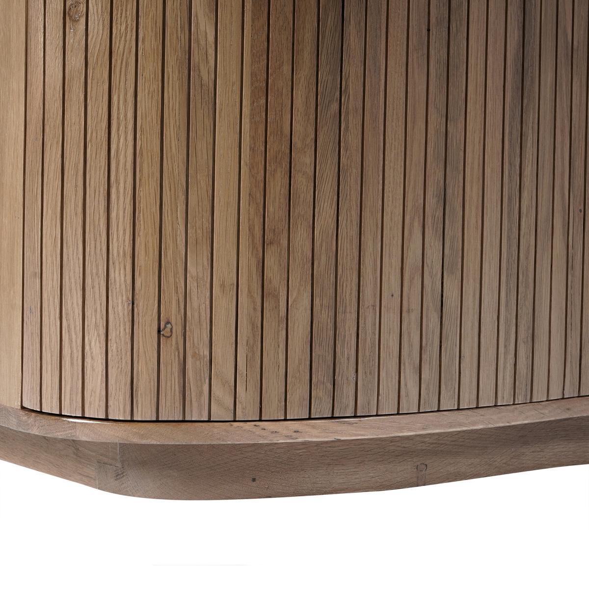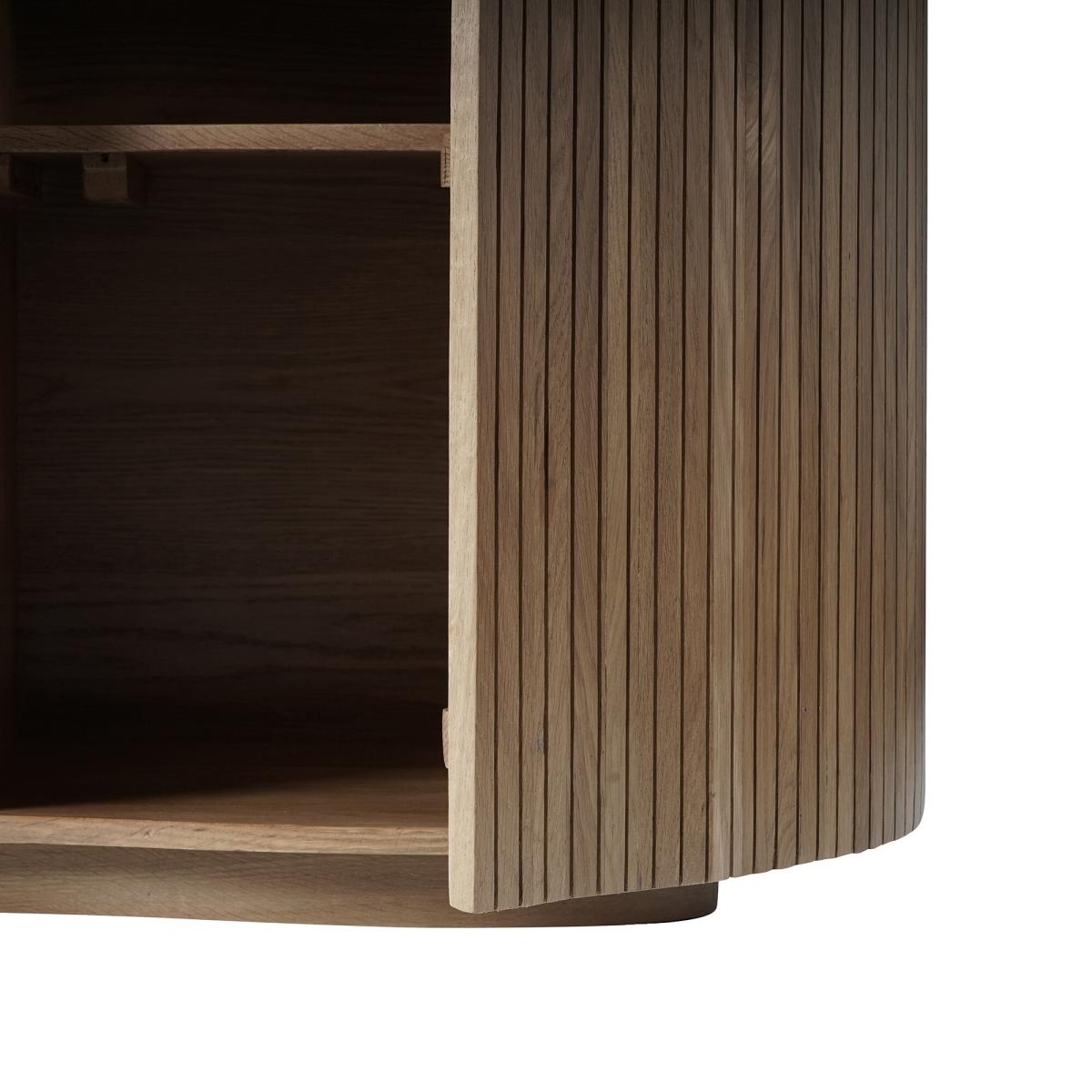 I love the simplicity and natural warmth of this sideboard-its oak wood finish adds a lovely touch of organic texture that fits well in both modern and traditional interiors. It works particularly well in living rooms, dining areas, or even hallways where you need practical storage without sacrificing style. To style it effectively, consider pairing it with minimalistic decor items, like ceramic vases or sleek lamps, and leave the top clear for display or casual dining accessories. Its understated design makes it versatile, so it can blend seamlessly with neutral palettes or be a statement piece within a more eclectic space. The rounded edges also soften its look, making it a practical yet stylish addition to contemporary schemes.