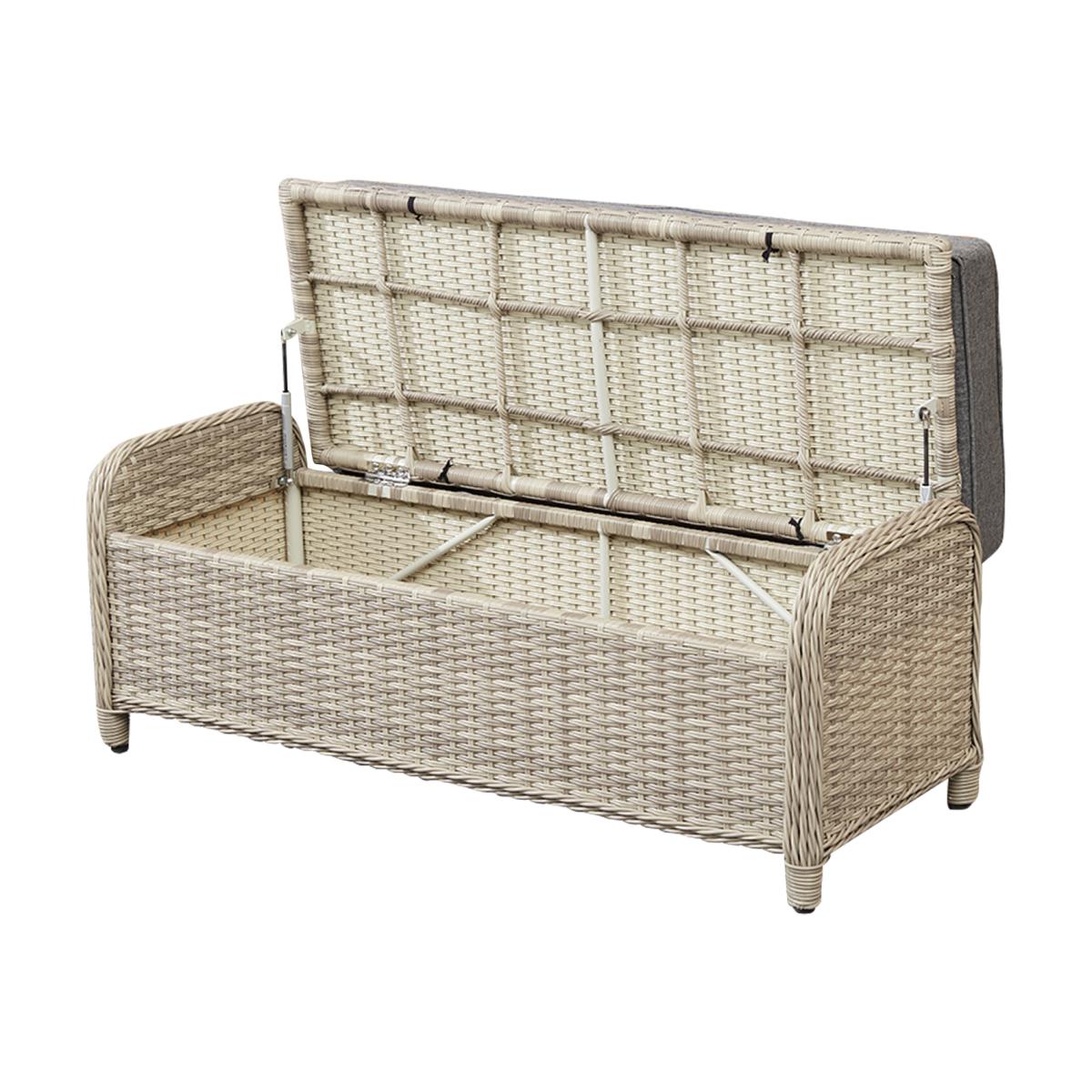 I love this bench for its versatility and natural appeal. Its rattan finish lends itself well to both traditional and contemporary outdoor settings, adding a touch of relaxed elegance. Inside, it works beautifully as a statement piece in a sunroom, conservatory, or even a spacious hallway. Practical styling tips include pairing it with floral cushions for a cosy feel or using it as a stylish storage solution in entryways by placing baskets inside for organisation. Its neutral tone makes it easy to coordinate with various colour schemes and materials, from wicker and wood to metal accents. This bench conveys a laid-back charm without sacrificing functionality, making it an excellent addition to classic or modern interiors that aim for a light, airy vibe.