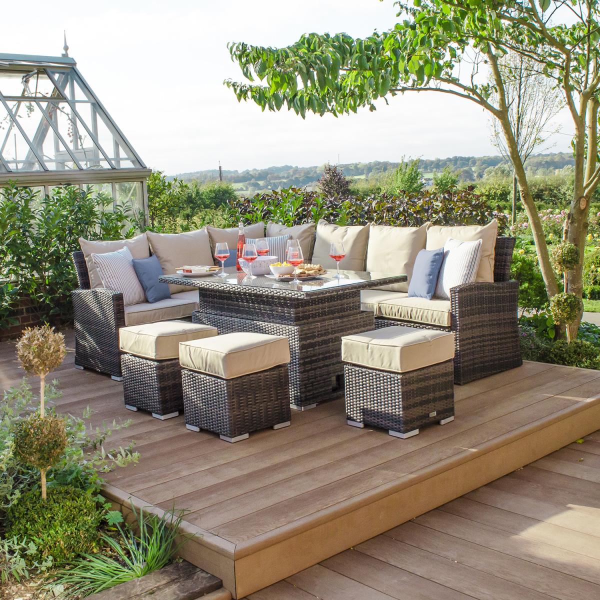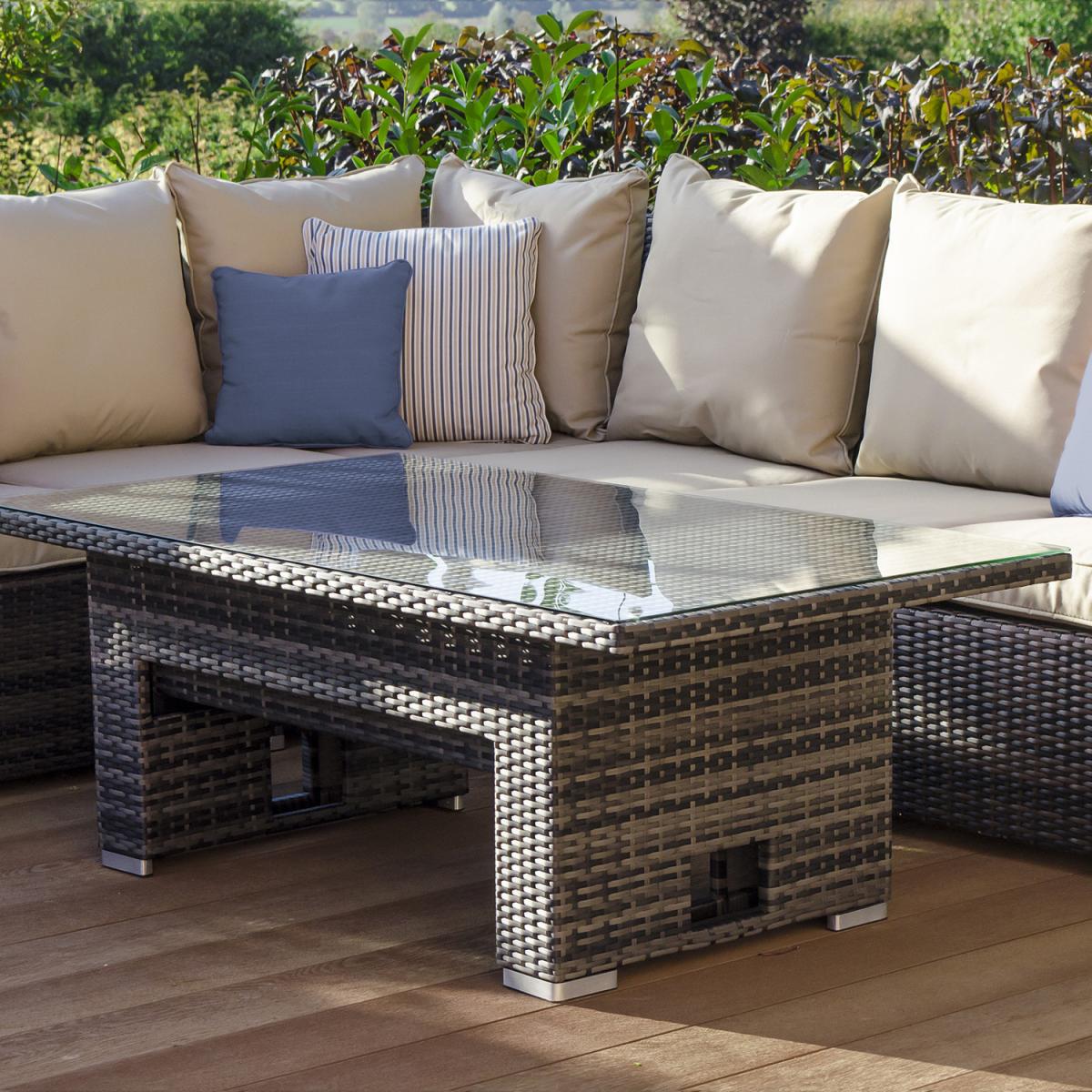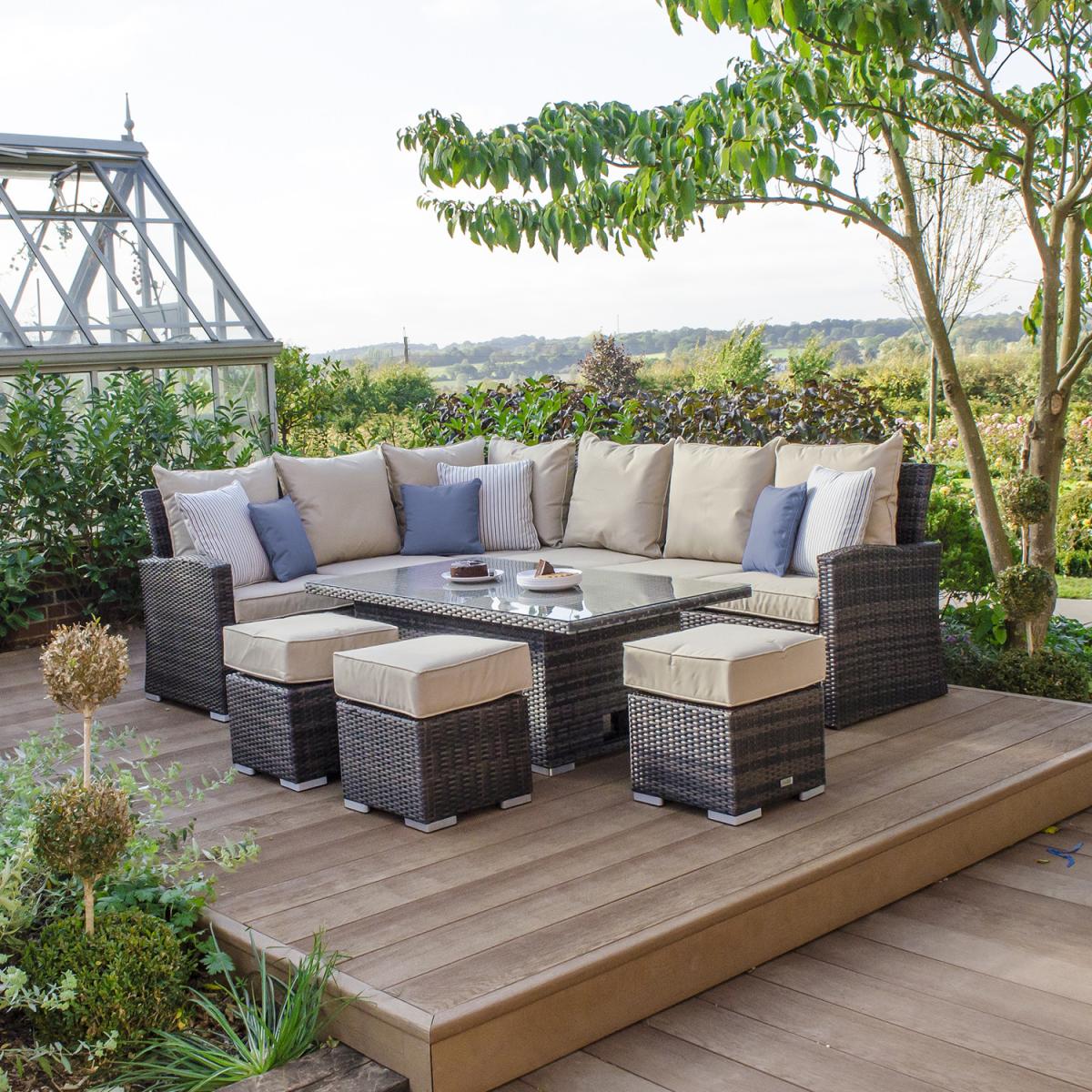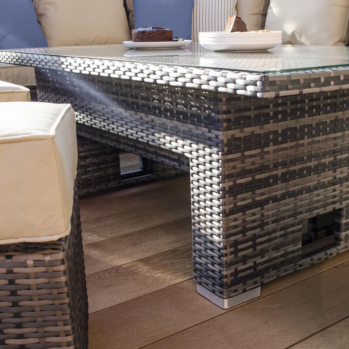 The Cambridge Casual Dining Corner Sofa Set with Rising Table is a dining set with a difference. Specially designed for comfort and relaxation, this luxury set would comfortably seat 5, but the 3 footstools double up as extra seating, allowing for 8 guests. Developed to fit into gardens which require a left-hand setup, the rising table allows you to switch between a coffee table and a casual dining table in a few simple movements. This means that you can enjoy a relaxing corner sofa with a low coffee table, ideal for a tea and slice of cake, or a casual dining table ideal for al fresco dining with friends and family. This means the furniture does not take up extra space in your garden but can be used for multiple purposes.