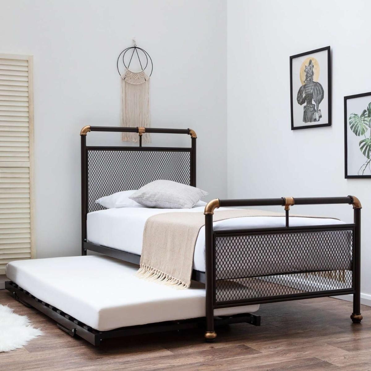 The Cambridge is a unique metal bed frame that reflects the popular on-trend urban industrial style. The cool design features a dark rustic brown bed frame, with brushed brass copper scaffold style joints and casting details. The headboards and footboards have mesh effect panels that give the bed a super edgy industrial look. The trundle folds out into a single bed ready for use, then it simply folds back again, and rolls away under the bed when not in use. The trundle bed is sprung slatted and fits a UK standard single 3ft mattress. Note The trundle is intended to be used as a separate bed, and not put against the main bed.