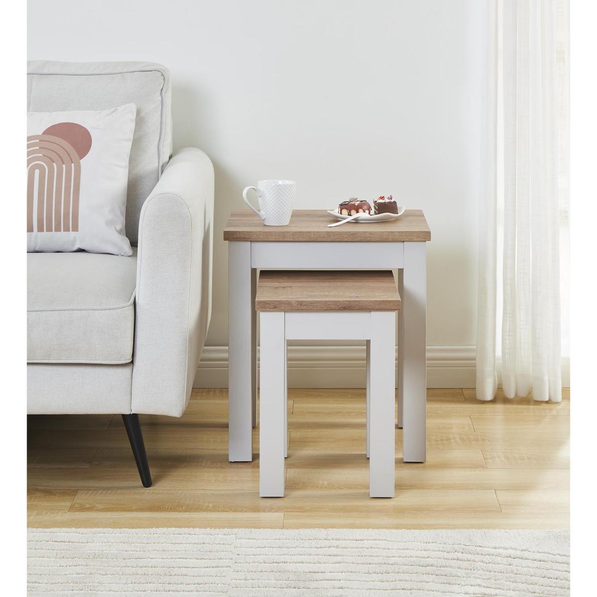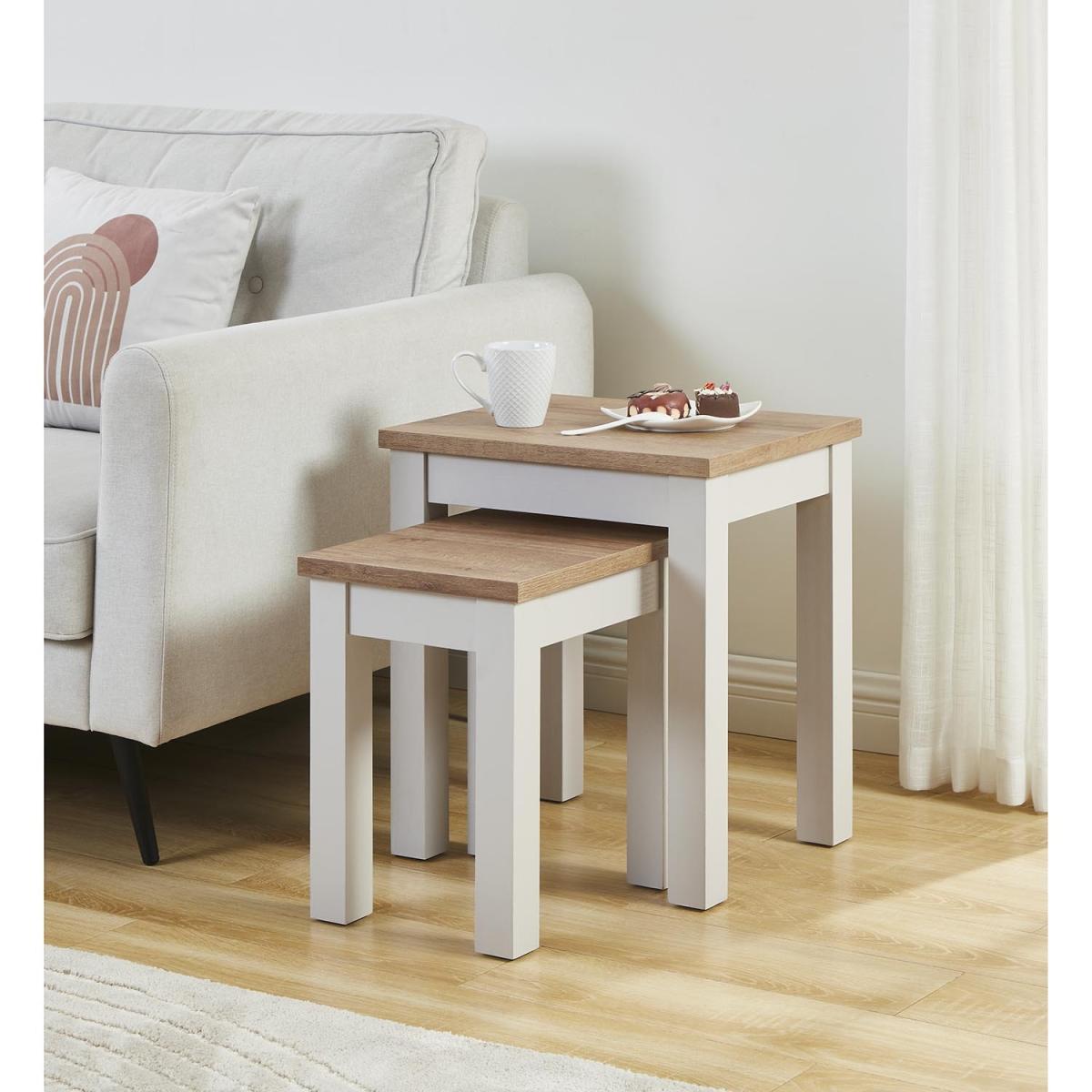 I often reach for the Cambridge nest tables in grey when I need flexible surface space in a living or snug area. Their clean lines and light oak tops work brilliantly in Scandinavian-inspired or modern farmhouse schemes, and they’re slim enough to slot beside a sofa or into a narrow hallway. For styling, pull out the smaller table to create a tiered drinks station or beside a reading chair with a stack of art books and a small potted plant. When not in use, they simply tuck away to keep the room feeling uncluttered.