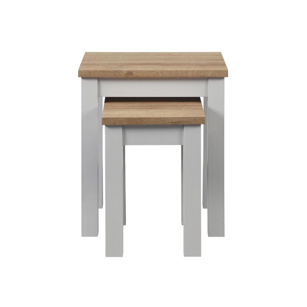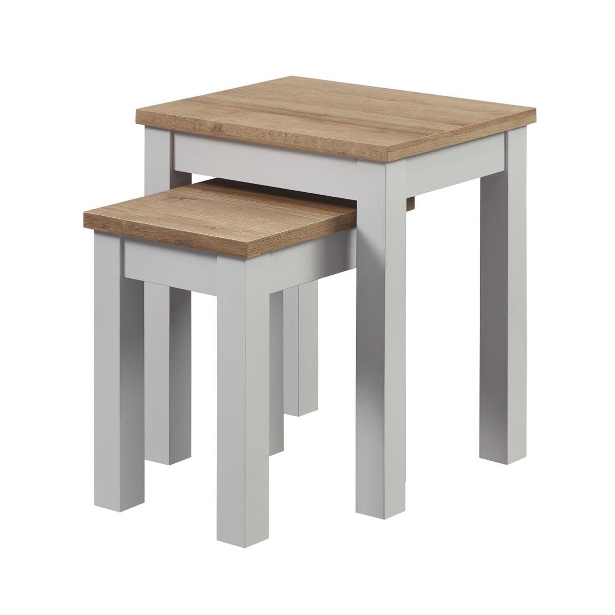 With a modern oak effect finish and contrasting light grey legs, this Cambridge Nest of Tables offers a perfect match for your living room. It's easy to assemble and easy to clean, making it the ideal choice for busy family homes. Helping you make the most of your storage space whilst giving you more surfaces when people come over - ideal for somewhere to pop drinks and nibbles. The gorgeous colour and contemporary design makes this set of tables easy to coordinate with your existing decor and giving your living space a fresher feel.