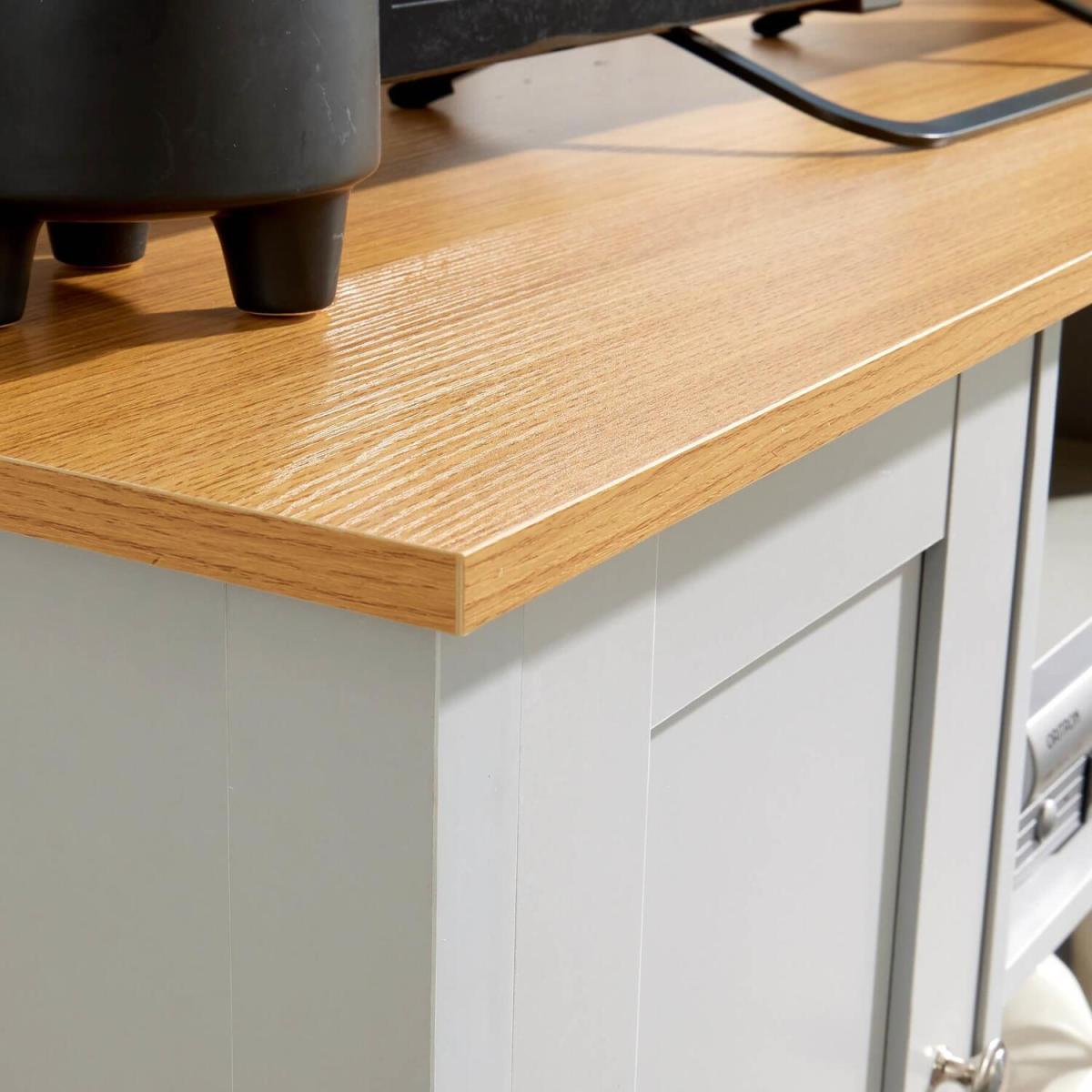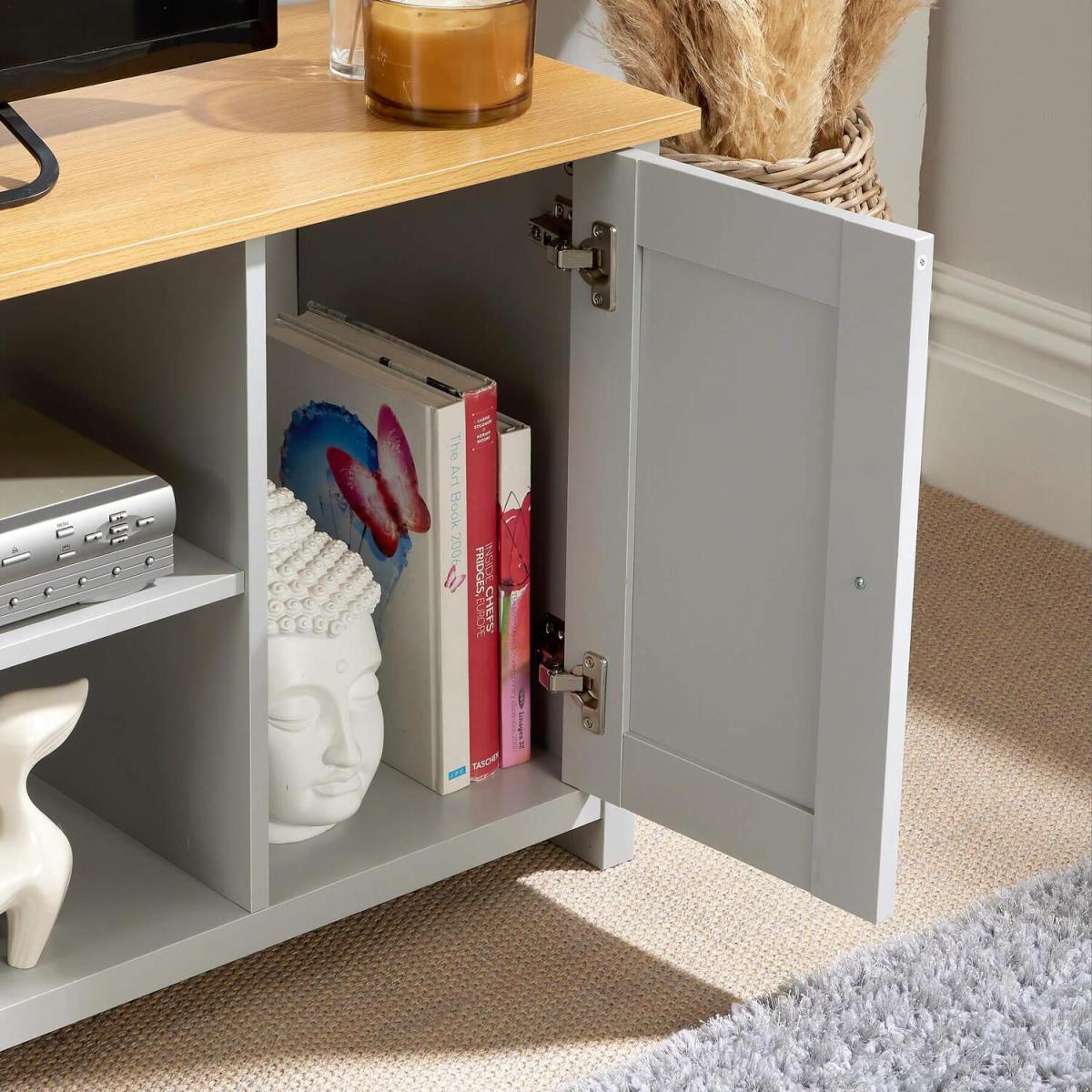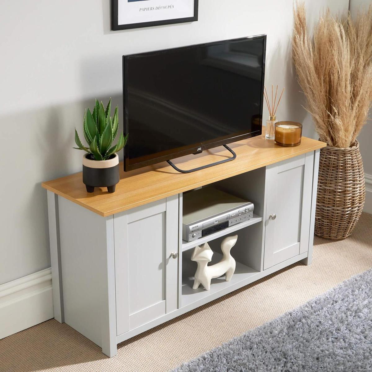I’m a fan of this grey two-door TV unit because its clean lines and soft mid-grey finish slot neatly into Scandi, contemporary or even cottage-style living rooms. The oak-effect top adds warmth and the twin doors hide away games or remotes, while the central shelf is perfect for your DVD player or a neat basket of chargers. For styling, keep the surface clutter-free: a low-profile TV, a potted succulent and a small table lamp give it balance without overwhelming. In the open centre cubby, layer height-varying pieces - perhaps a stack of books beside a small sculpture or a woven tray. Tuck cable boxes behind the doors and use slim cable clips at the back to maintain that crisp, tidy look.