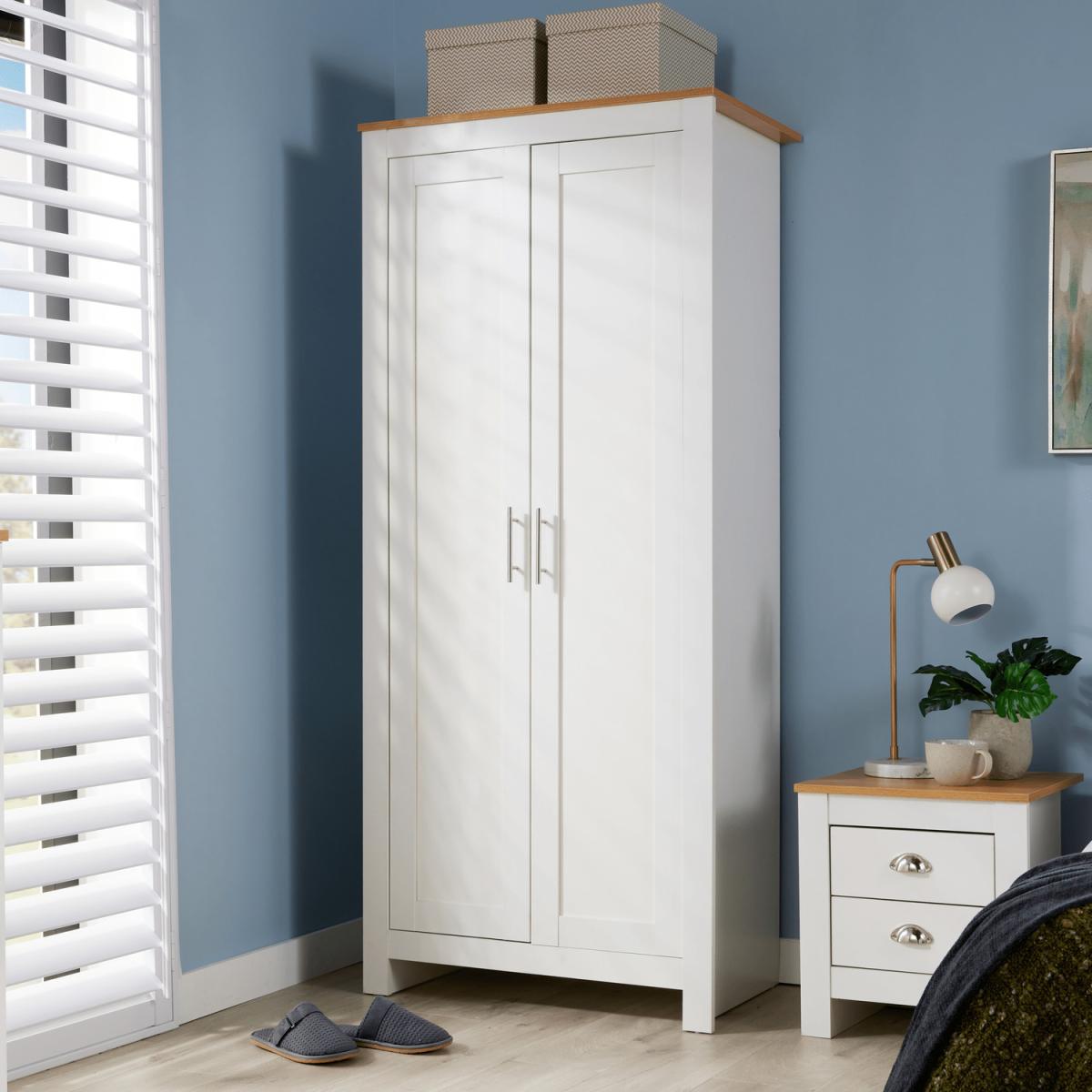I’m a fan of this Camden wardrobe for its clean lines, soft-white finish and oak-effect top, which slot effortlessly into Scandi, coastal or modern farmhouse bedrooms. It’s tall and slim so it won’t overwhelm smaller rooms, yet the double doors still give generous hanging and shelf space for clothing or linens. Styling tip: keep the top simple with woven baskets or a low planter and a neat tray for keys or jewelry. Pair it with a matching bedside unit or a full-length mirror to create a coordinated look. Inside, use labelled boxes or fabric bins to make the most of the shelves and maintain easy organisation.
