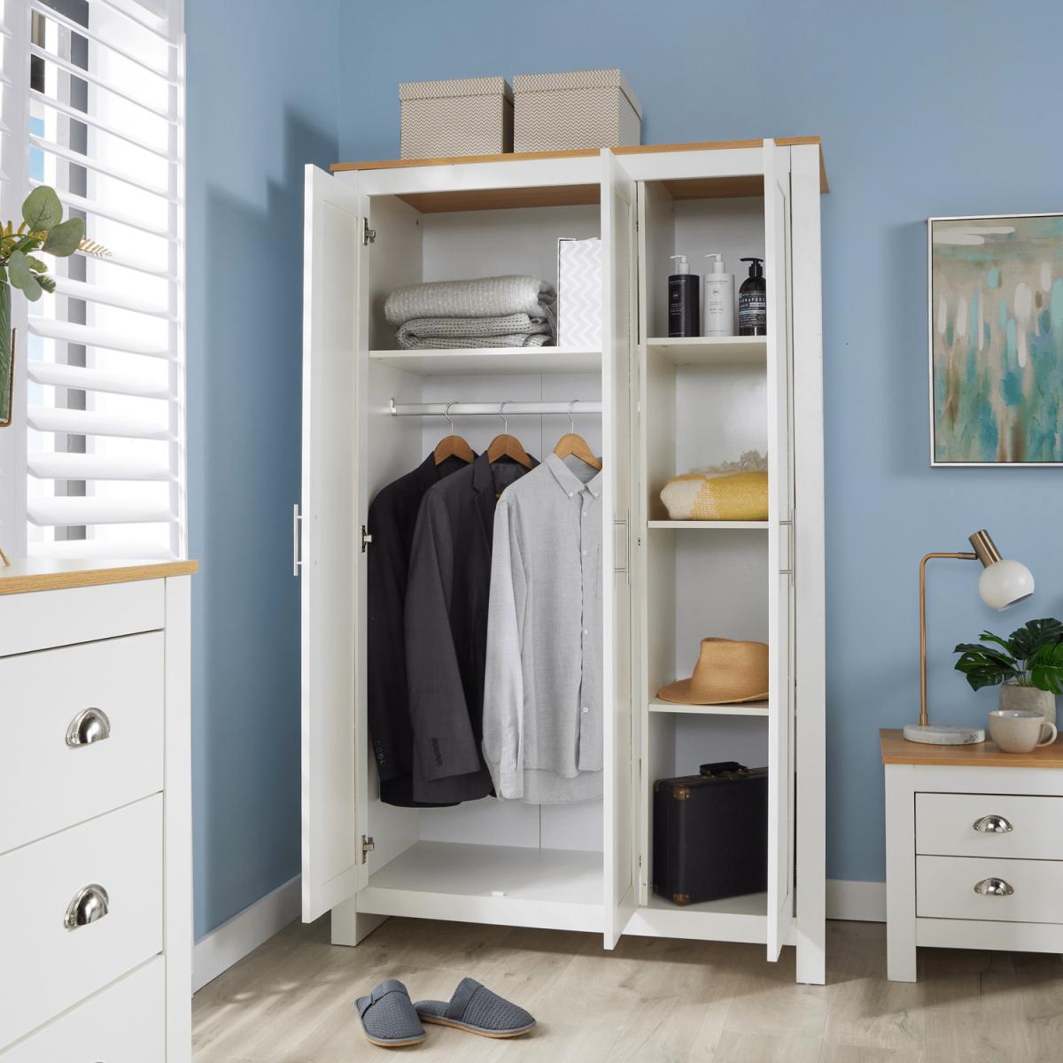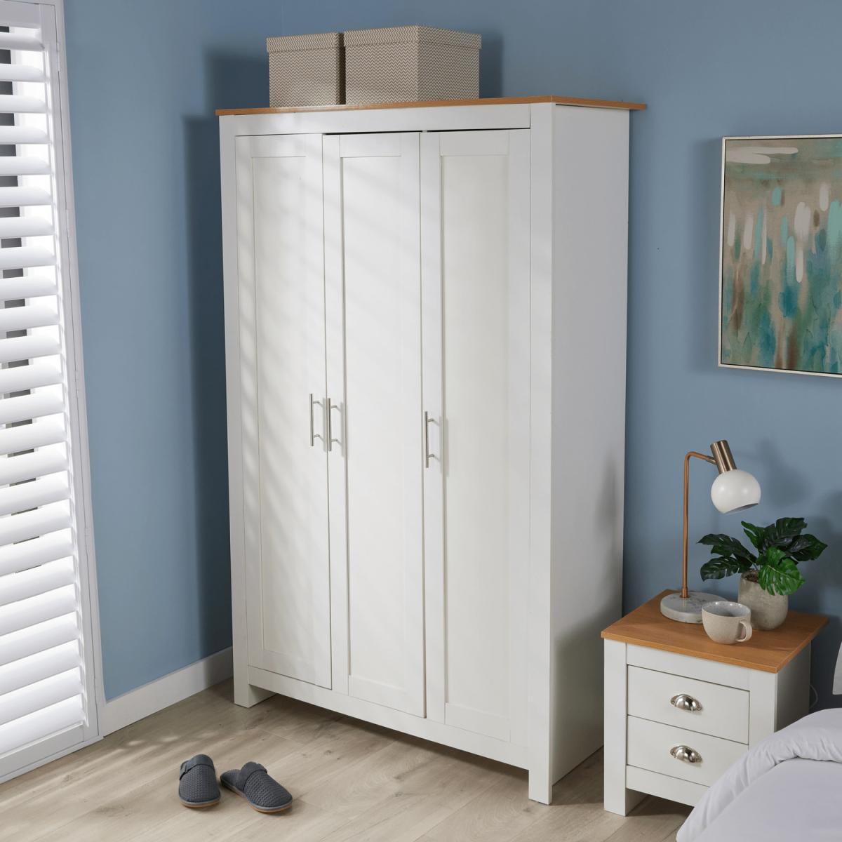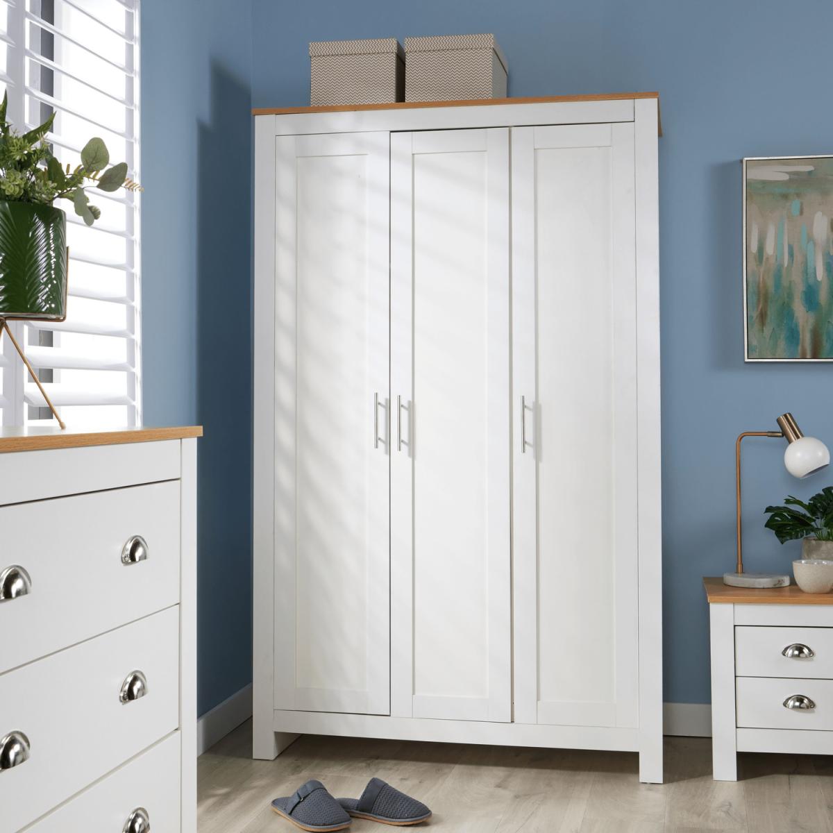 Bring your bedroom to life with this modern triple wardrobe. Extremely stylish, each of the three doors features a panelled design with decorative silver handles for that added detail. The modern clean finish and two tone oak top are contemporary and stylish. Store clothing and shoes behind each door, with a hanging rail plus ample shelving available. A practical choice for your bedroom.