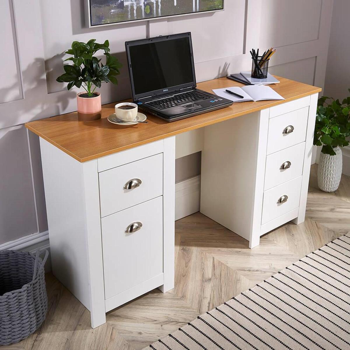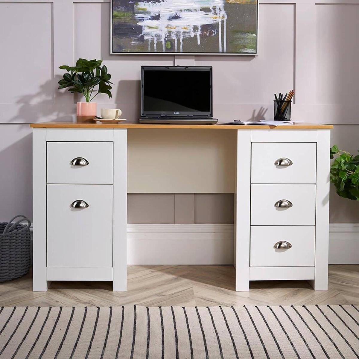 I’m a fan of the Camden desk because its clean white finish and oak-effect top strike a versatile balance between classic and modern. It works well in Scandi-inspired spaces or pared-back home offices, but equally suits a soft farmhouse or coastal scheme. For styling, keep the desktop clear except for a slim pen tray, a small potted plant and perhaps a brass-tone lamp to pick up on the drawer handles. Use matching white or woven baskets underneath to corral papers and hide chargers. A simple geometric rug and wall shelf above will complete a neat, functional set-up.