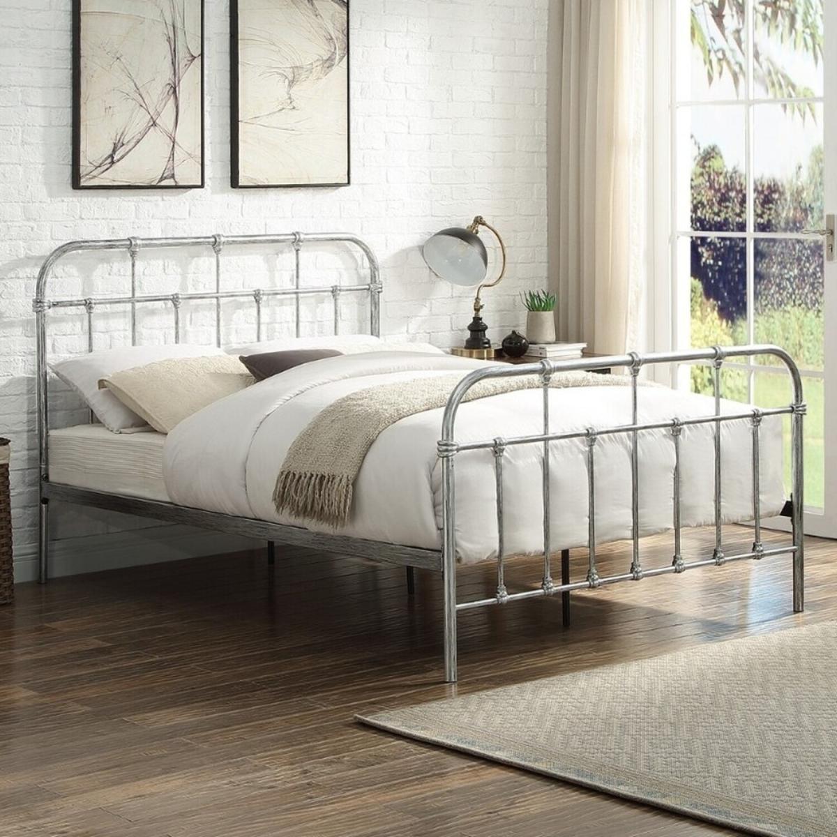 Elevate your bedroom with the vintage-inspired Camden Metal Bed Frame exclusive to OAT Home. Hand brush painted in a silver steel distressed effect over a black underlay for a rustic industrial look. With a metal bar slatted base, enjoy breathability for your mattress and sturdy support. Lightweight yet robust for easy assembly and lasting use.
