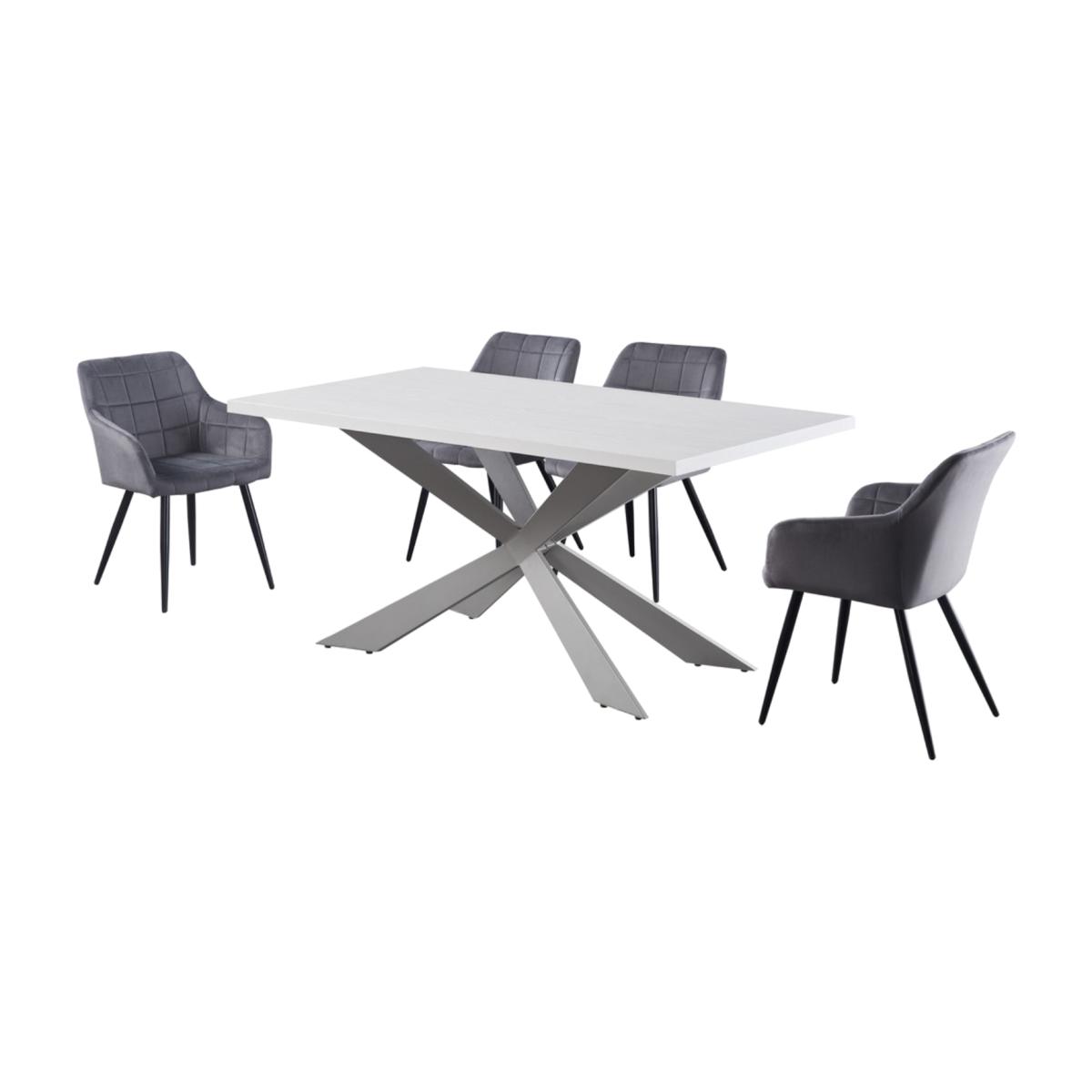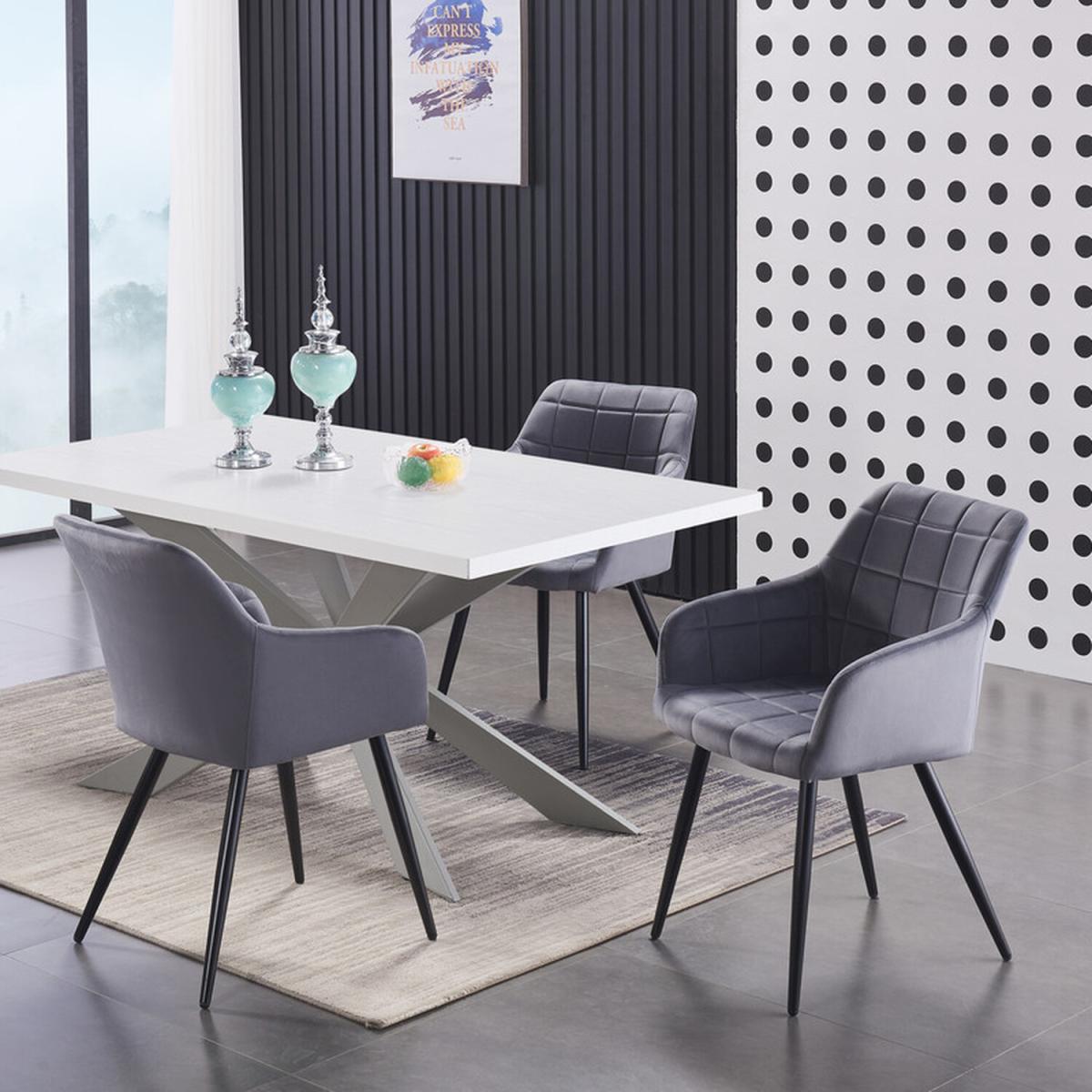 We are offering the dining set of 4 that includes the Duke Table which is a stylish aesthetic that is sure to start a conversation. The Metal powder coated legs are sturdy and built to stand the test of time and with their X-form design make a striking statement. Be ensured that every breakfast, lunch and dinner will be perfect thanks to the reliability of the Duke Dining Table. Comes with the Camden velvet Dining Chairs have been created with precision and fine attention to detail which makes this chair a perfect addition to your home. With its simple and streamlined yet high-end look will add a hint of luxury to any space in your home. By combining a simple classic look with velvet and hand stitching the Camden will make the perfect chair for your dining room, bedroom, lounge or even your home office. Wherever you decide it fits it will help you relax and unwind in style. The beautifully stitched square pattern combined with its velvet material and cushion padding give the Camden a fashionable and comfortable feel while its metal legs and frame add stability and durability to its beautiful design.