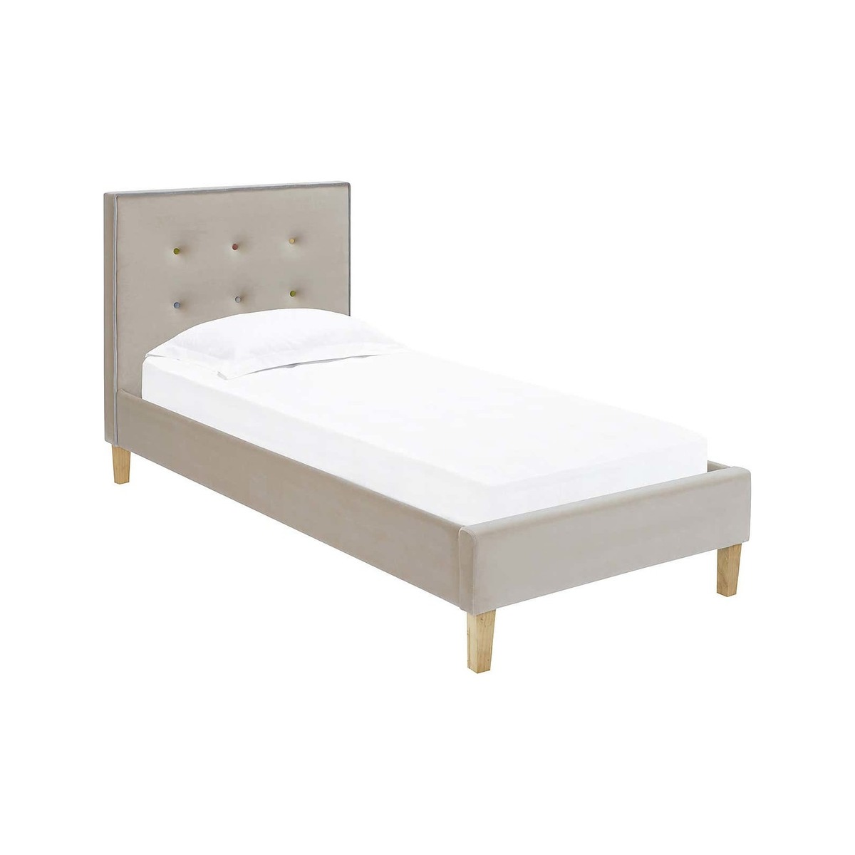 The lovely Camden Fabric Bed Frame is upholstered in soft and sumptuous velvet fabric. Contrasting coloured button detailing on the headboard give a fresh, contemporary feel to any bedroom. Please note, price is for bed frame only and does not include mattress.
