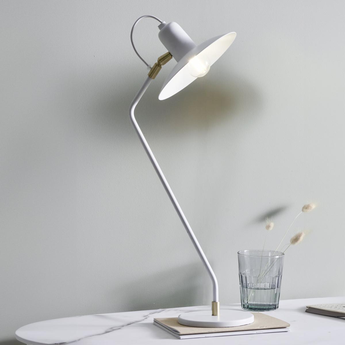 * Requires 1 x E27 Bulbs (Not included)* Effortlessly stylish and contemporary design. * Striking matt white with brushed brass metal detailing. * Moveable shade for directing light, minimalist yet impactful. Effortlessly stylish and contemporary, the Camden Matt White Metal Angle Arm Task Table Lamp adds a modern touch to any interior. With a moveable shade and striking matt white finish with brushed brass detailing, it offers maximum impact in minimalist design.