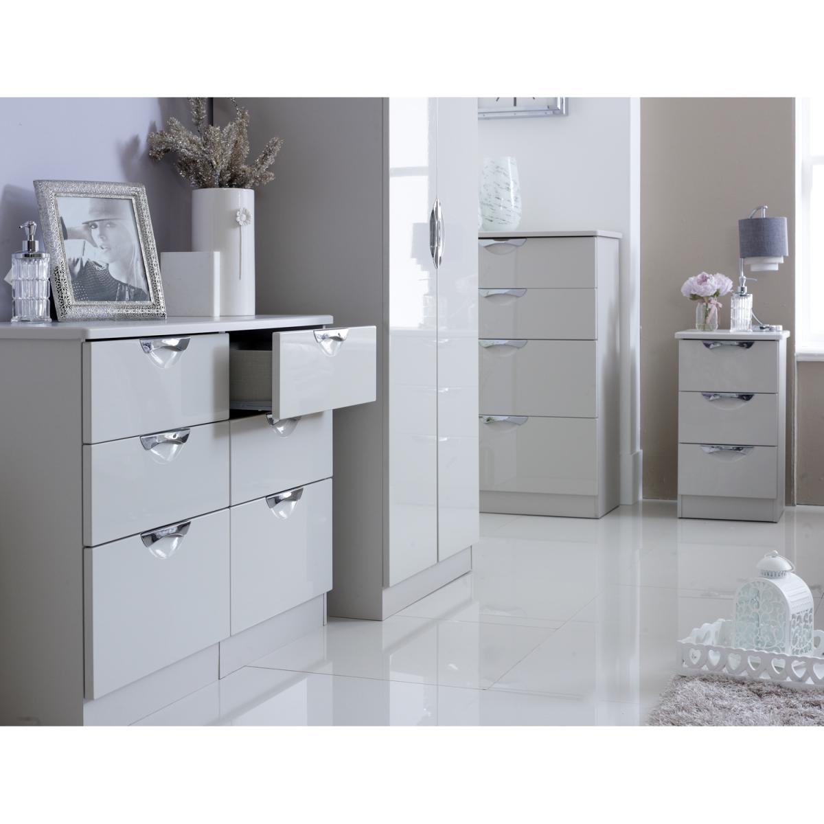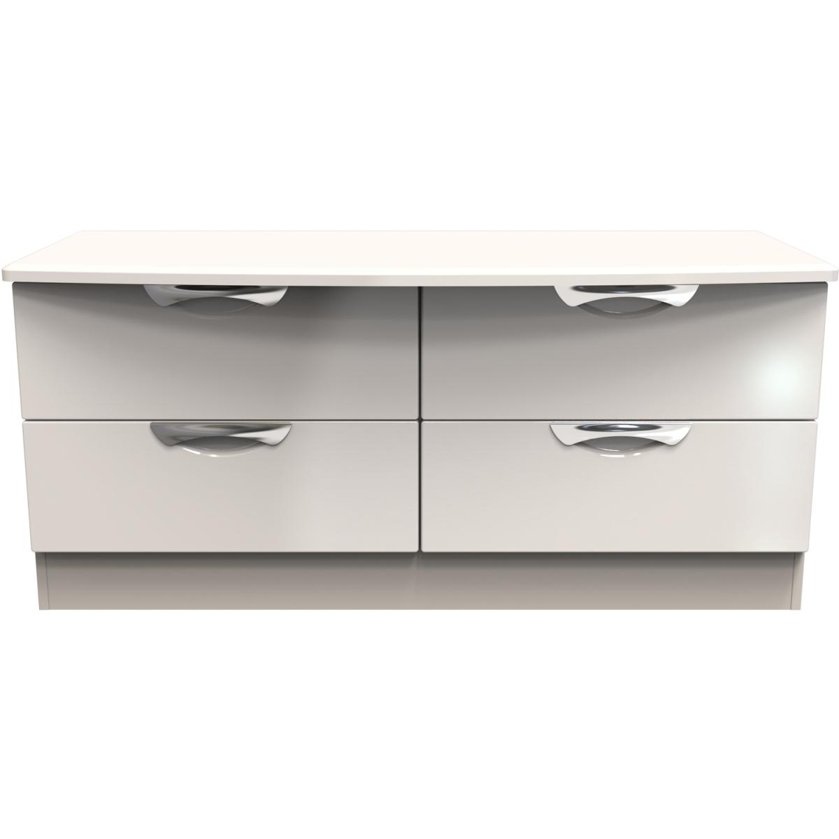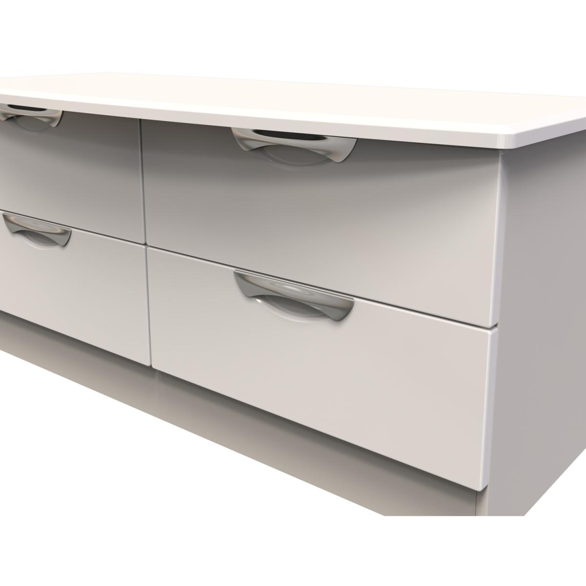 A large 4 drawer bed box. A Perfect storage solution for any room (not just the end of your bed). Could also be used as a low level TVMedia stand. Boasting a clean, contemporary look and pleasing practicality, the furniture range makes a seamless addition to any modern looking home. The range offers an array of practical, organised space for items both large and small that will help keep your room neat and tidy. All pieces have a scratch-resistant veneer to help prevent the wear and tear that can come with everyday usage, while the extensive colour options of the drawers and doors is complemented by distinctive cut-out handles and a smooth finish for a great mix of style and functionality. All our furniture is made in the United Kingdom, to the highest quality. It is delivered direct to your location of choice by one of our two man delivery teams, and come full assembled (although legs may be removed to prevent damage in transit).