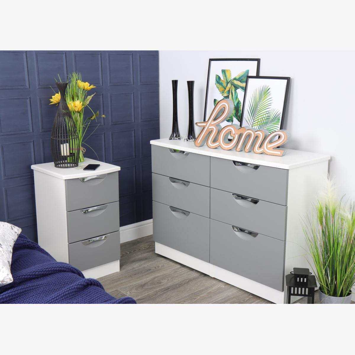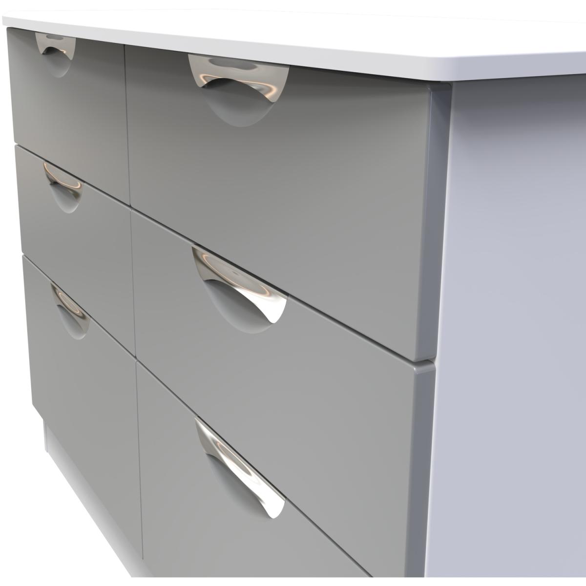 This double width 6 drawer chest of drawers is practical and stylish. Perfect for any home as a free standing storage unit. Boasting a clean, contemporary look and pleasing practicality, the furniture range makes a seamless addition to any modern looking home. The range offers an array of practical, organised space for items both large and small that will help keep your room neat and tidy. All pieces have a scratch-resistant veneer to help prevent the wear and tear that can come with everyday usage, while the extensive colour options of the drawers and doors is complemented by distinctive cut-out handles and a smooth finish for a great mix of style and functionality. All our furniture is made in the United Kingdom, to the highest quality. It is delivered direct to your location of choice by one of our two man delivery teams, and come full assembled (although legs may be removed to prevent damage in transit).