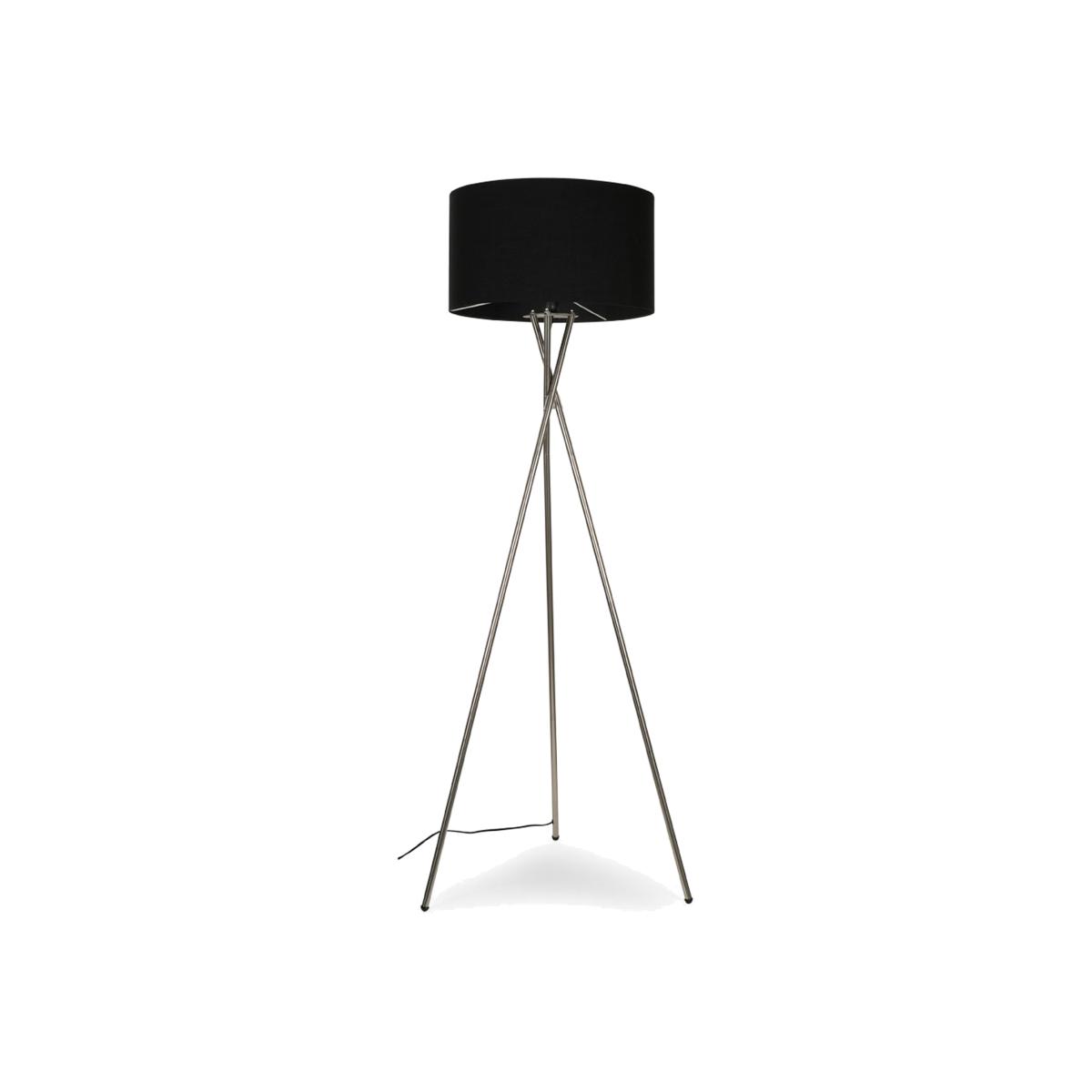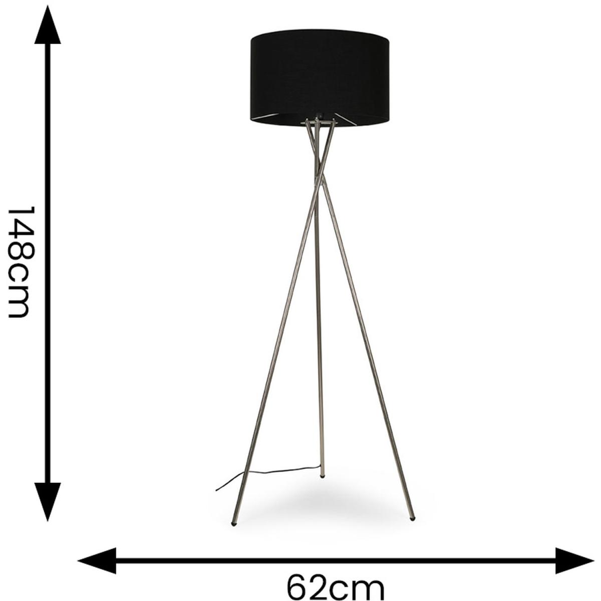 Tripod floor lamp in a polished chrome metal finish, complete with a Modern cylinder drum shaped light shade in a black polycotton finish, featuring an in-line onoff foot switch for easy use. Floor lamps are a great way to bring additional lighting to a room. Ideal for lounges, hallways, bedrooms and other areas around the home.