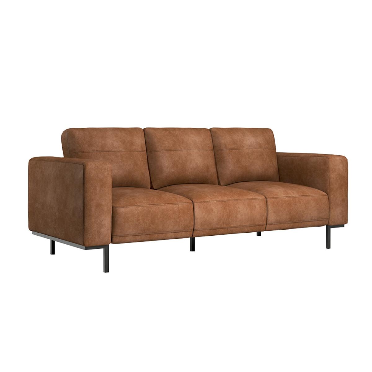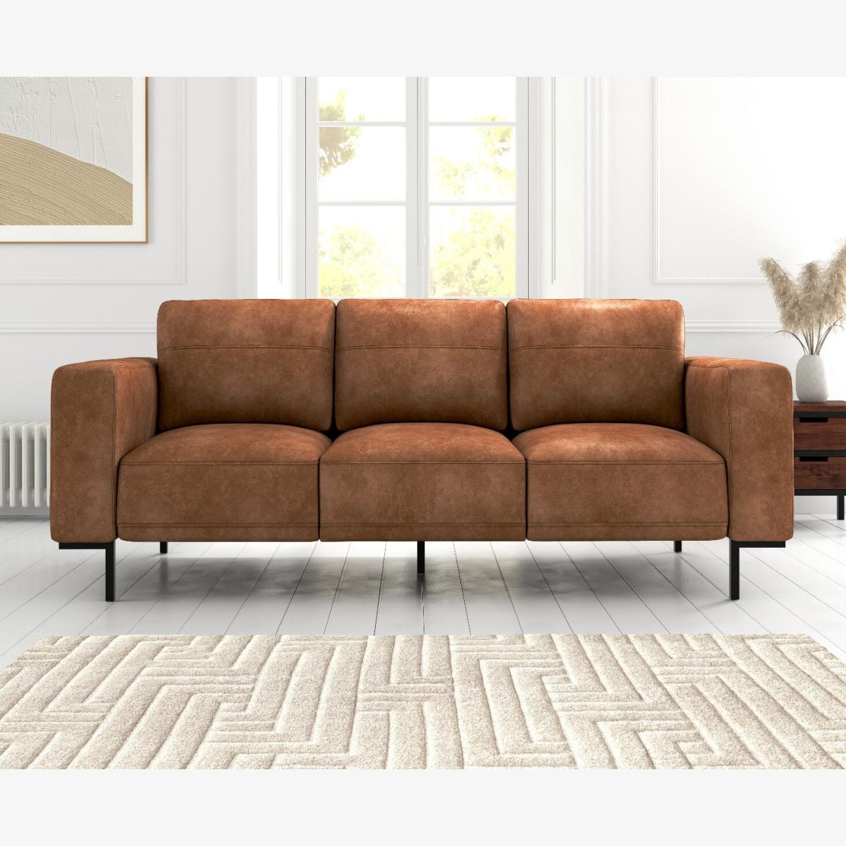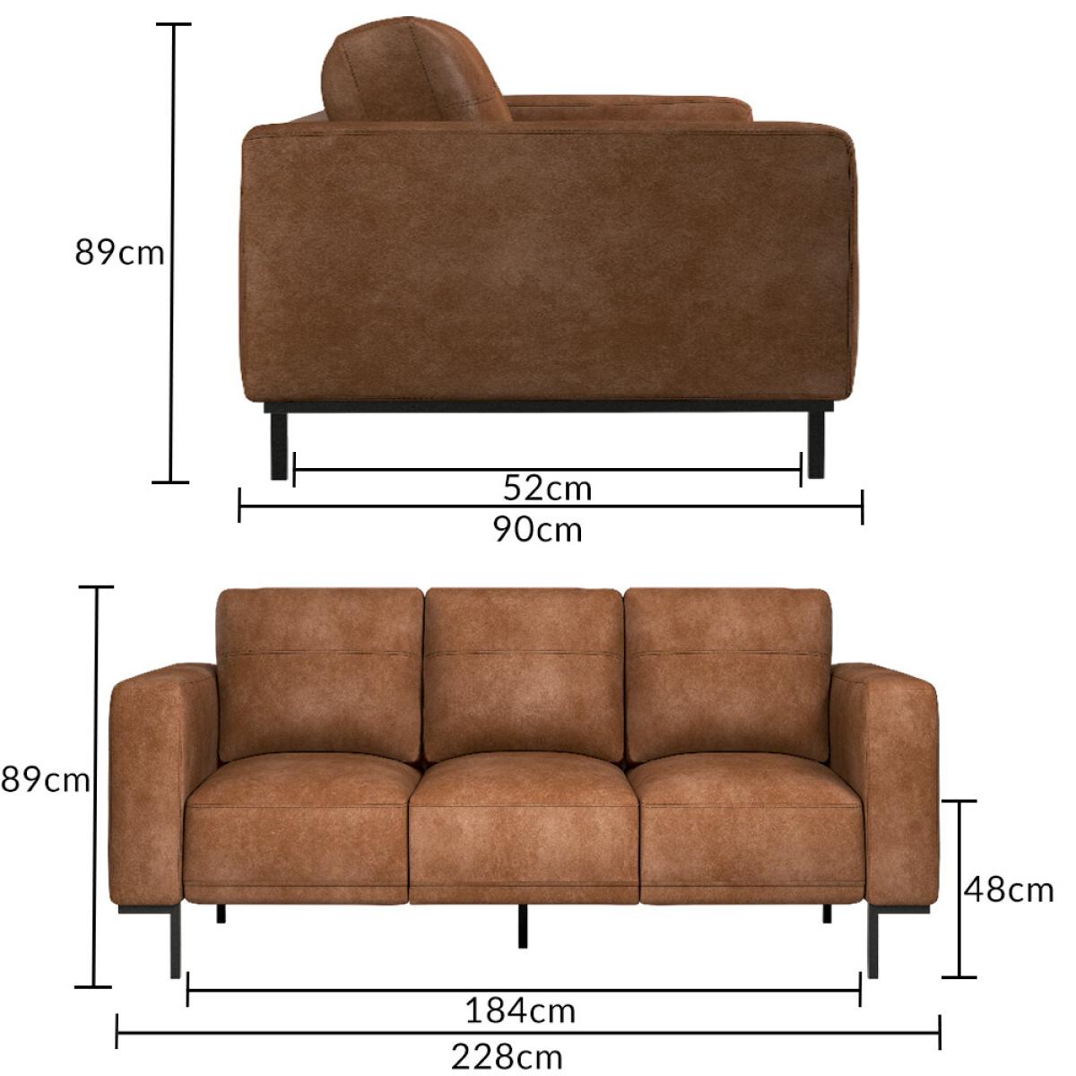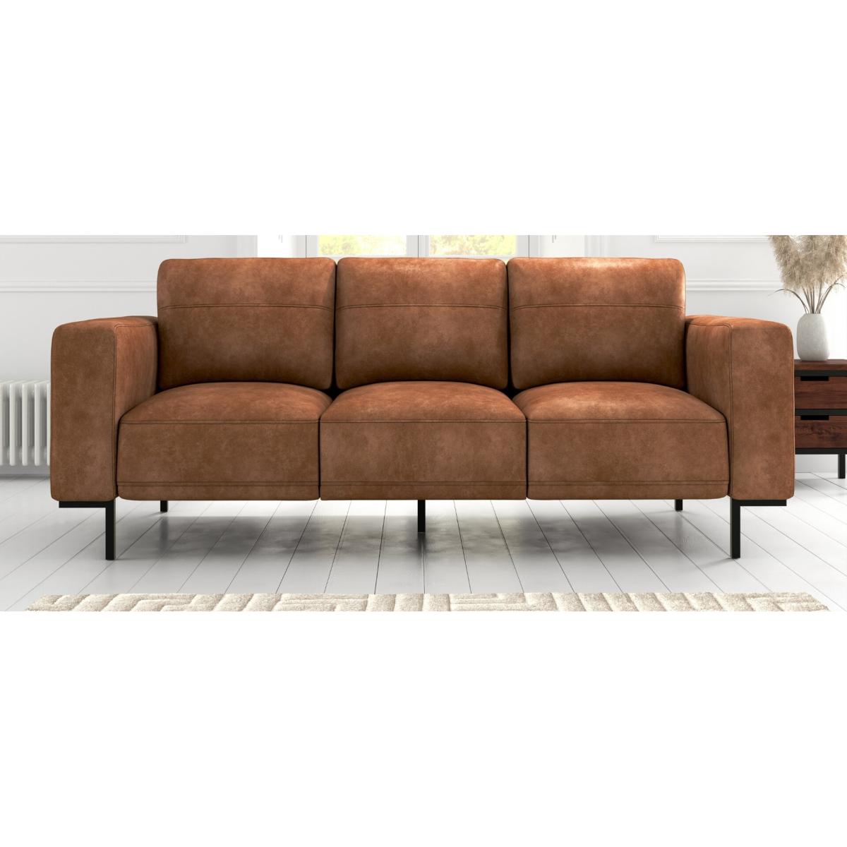 I’m a big fan of this tan three-seater sofa for its clean lines and the way the warm faux leather brings both texture and comfort to a room without the maintenance of real hide. Its slim metal legs and squared arms give it a modern edge, making it equally at home in a minimalist city flat or a relaxed country living area. To style, anchor it with a low-pile rug in a neutral shade and layer on cushions in muted greens or deep blues for contrast. A slim side table and a potted plant at one end keep things light and give you a convenient spot for coffee or a book.