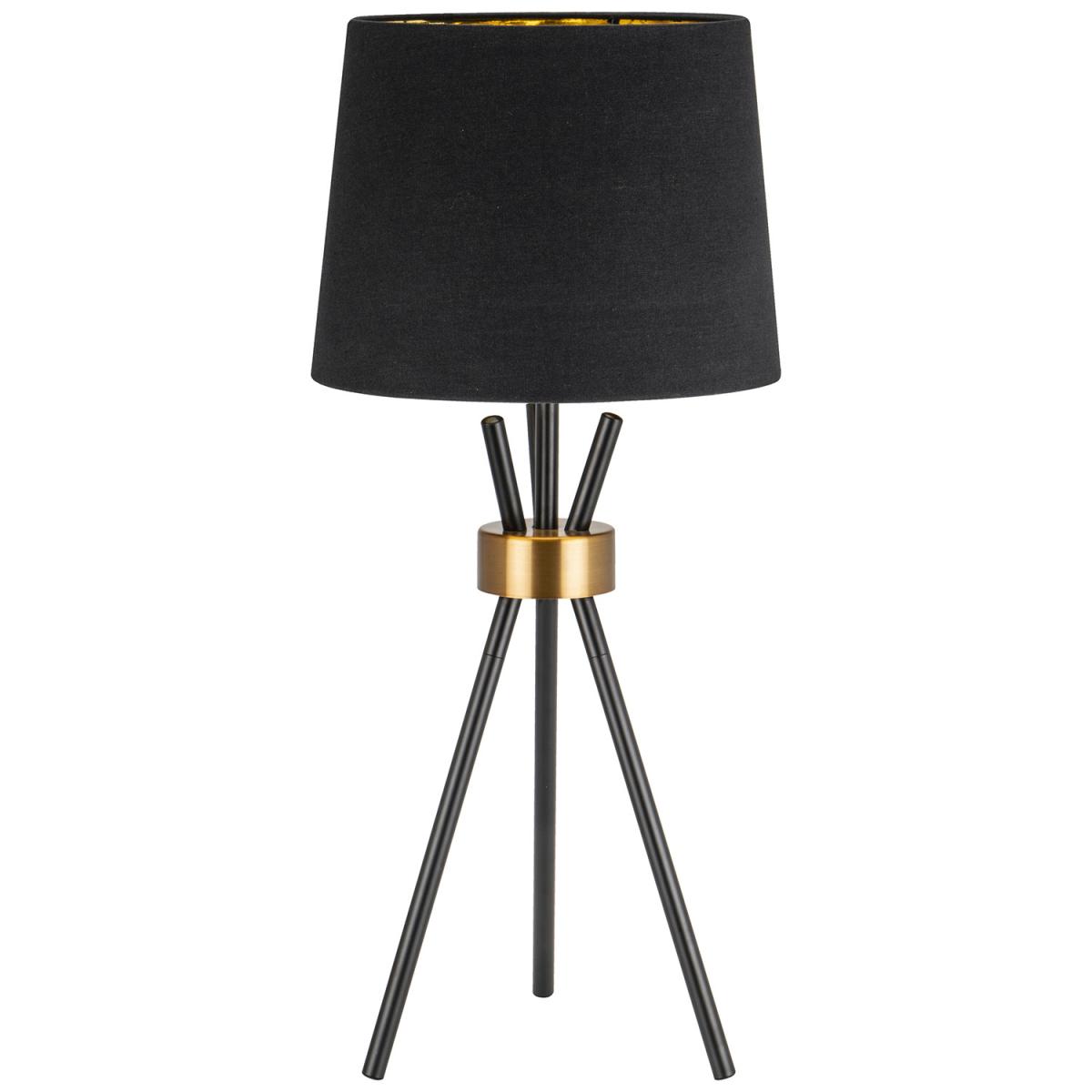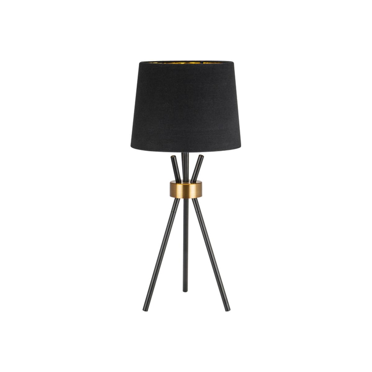 Standing on three jet black legs that are bound together with a metallic gold ring, this Camden Tripod Table Lamp is sophisticated and slender. Emanating modern refinement, this table lamp is complemented by a dramatic dark shade with reflective inner gold for a contemporary, ambient glow.