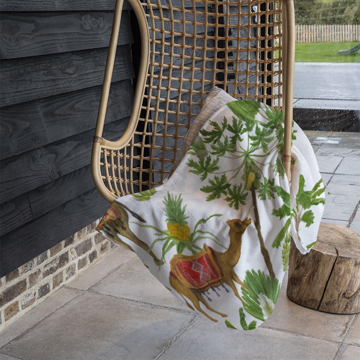 I love the South Seas vibe of this blanket; its vibrant green hue adds a fresh pop of colour to both neutral and more eclectic interiors. It works well draped over a sofa or armchair, bringing a relaxed, tropical feel to living rooms, or layered on a bed for a lively, inviting touch. Practical styling tips include pairing it with natural textures like rattan or linen to enhance its laid-back, organic aesthetic. Its bold pattern makes it a statement piece, so keep surrounding accessories simple to let it stand out. Perfect for adding colour and personality to a variety of interiors, especially those leaning towards a casual, boho, or coastal style.