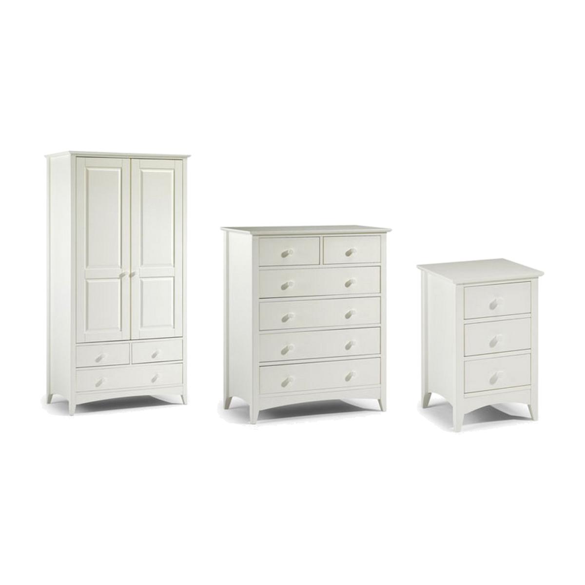 Beautifully crafted out of solid pine with a stone wash lacquer finish, this Julian Bowen Cameo Bedroom Package 1 uses a combination of style and practicality to give you a unit you can use every day. Perfect for storing away your shirts and dresses on the hang rail, this wardrobe will protect your favourite garments from dust and dirt. The convenient shelf above the hang rail offers you more storage space for bags, boxes, extra clothing, and more, while the drawers are an ideal storage solution for your bedding and shoes. The shaker style doors add to the simple design, giving the wardrobe depth. The durable and sturdy chest gives you four large drawers that you can fill with clothes, bedding and blankets, and two smaller drawers for important documents or cosmetics and the bedside table features three large, spacious drawers, perfect for storing away any evening reads, electronics, and journals. You can use the top of the chest of drawers and table to display seasonal blooms, a mirror, or small trinkets and ornaments, adding a personal touch to the understated design. Standing a little off the ground using thin legs, the bottom of each furniture unit curves slightly, giving the simple design an interesting shape. It is ideal for placing in your bedroom or guest room, perfect for your house and turning it into a stylish home you can be proud of.