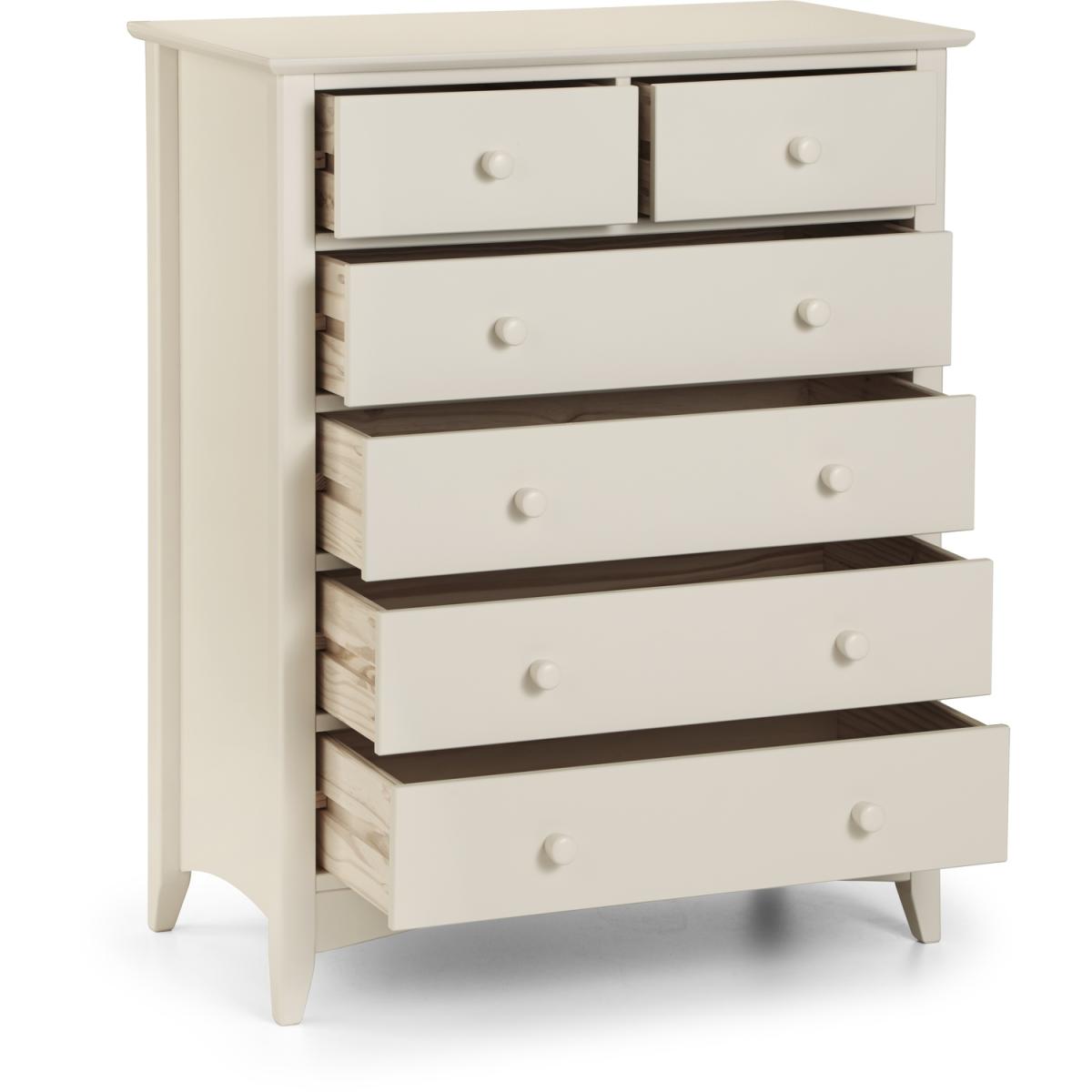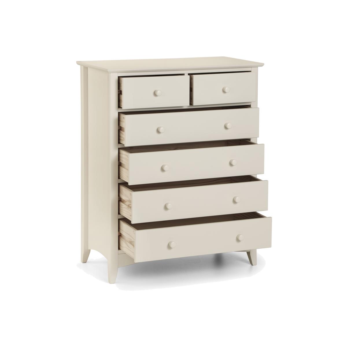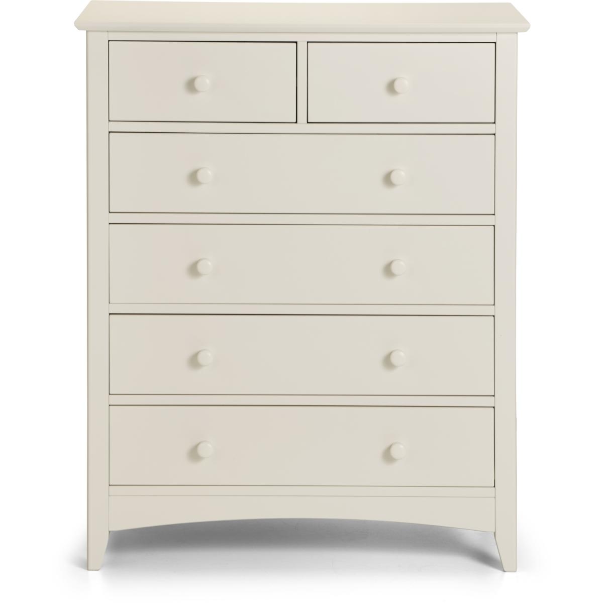 Cameo is a beautiful stone white lacquered bedroom range. Its timeless shaker design is the perfect accompaniment to any interior style and is perfect for grown-up bedrooms and children's bedrooms alike. Solid pine frames ensure sturdy and durable construction. The Cameo 4+2 chest offers a great storage solution with 2 small drawers and 4 large drawers