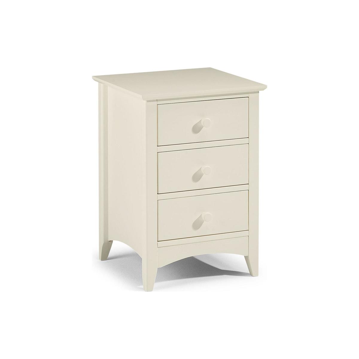 * Pine and MDF* Painted finish With everything you need within reach, you can rest easy knowing you're set for the night. The Cameo bedside is designed to maximise storage space, with three spacious drawers ideal for knickknacks, essentials, and more. The timeless look and stone white painted finish of this bedside is sure to suit a variety of homes and is perfect for classic or country styles.