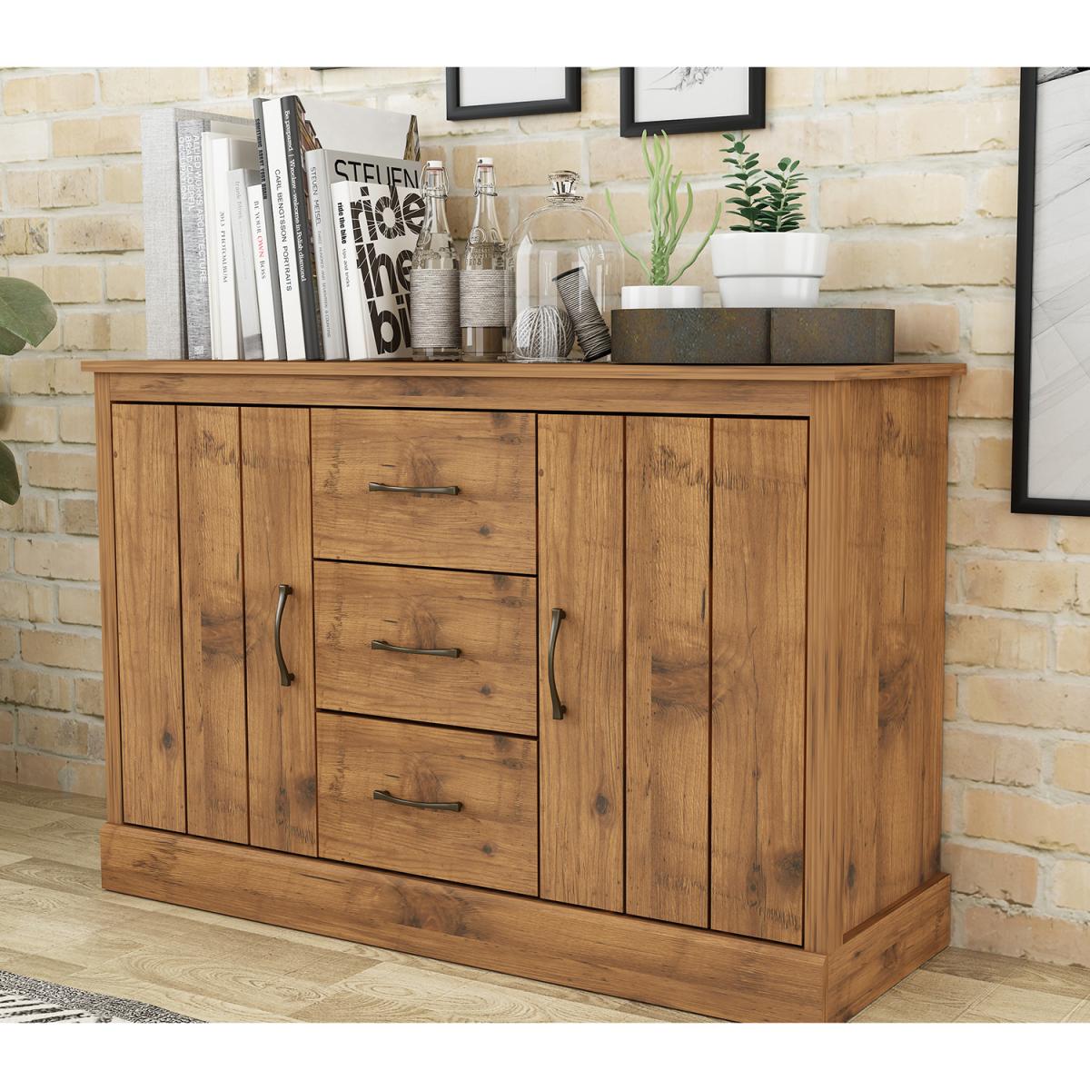 I’m a fan of this Camford sideboard for its warm, reclaimed-wood look and solid proportions - it adds an instant layer of texture without overwhelming a room. Its simple lines and black-metal handles slot straight into industrial, farmhouse or Scandi-minimalist schemes, while the three central drawers and twin cupboards keep everyday clutter neatly out of sight. Styling wise, I’d anchor it beneath a large mirror or gallery wall, then layer in a mix of ceramics, books and a low-slung tray to catch keys or remotes. Inside, use small baskets or dividers in the drawers to corral chargers and stationery, and consider low-profile LED strip lighting for a practical yet atmospheric glow.
