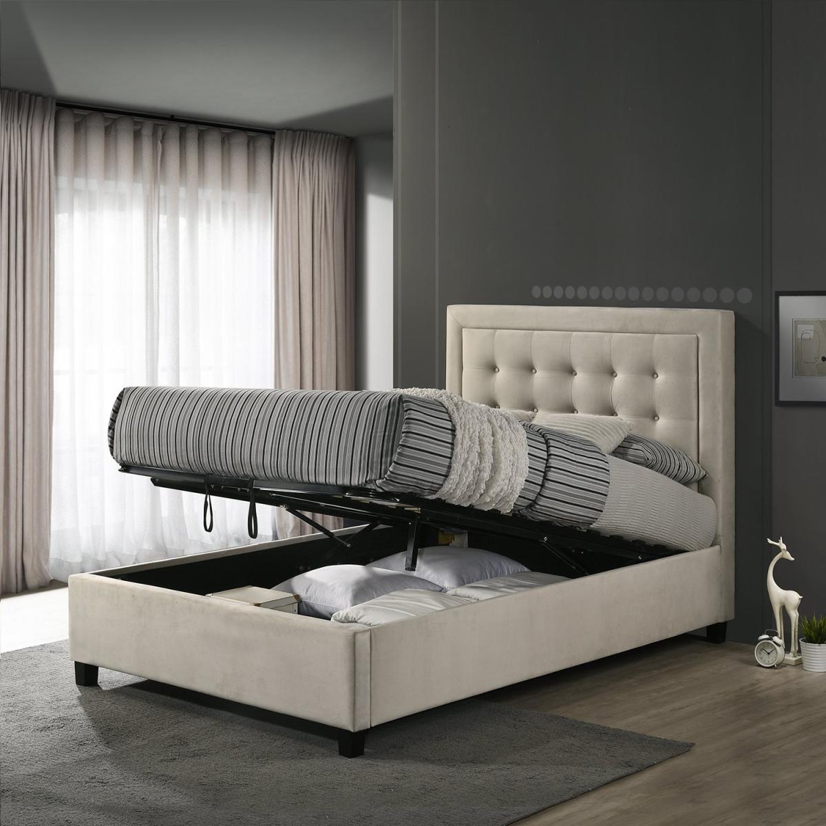 The Camila Ottoman Bed is a beautiful addition to any bedroom. Four square feet provide a sturdy base to a luxuriously soft bedframe, while the padded headboard offers a stylish accent against your wall. Button detailing on the headboard showcases a much-loved traditional design, while the modern lines and smooth velvet upholstery bring contemporary chic in abundance, and modern practicality comes in the form of the lifting ottoman function. Tidily store spare bedding or out-of-season clothing away when you don't need it, and then lift the slatted base to easily access all your belongings when you need them. This storage bed is ideal for smaller bedrooms or simply for creating a tidier space, and helps to facilitate a peaceful night's sleep.