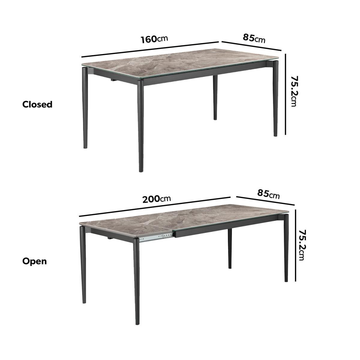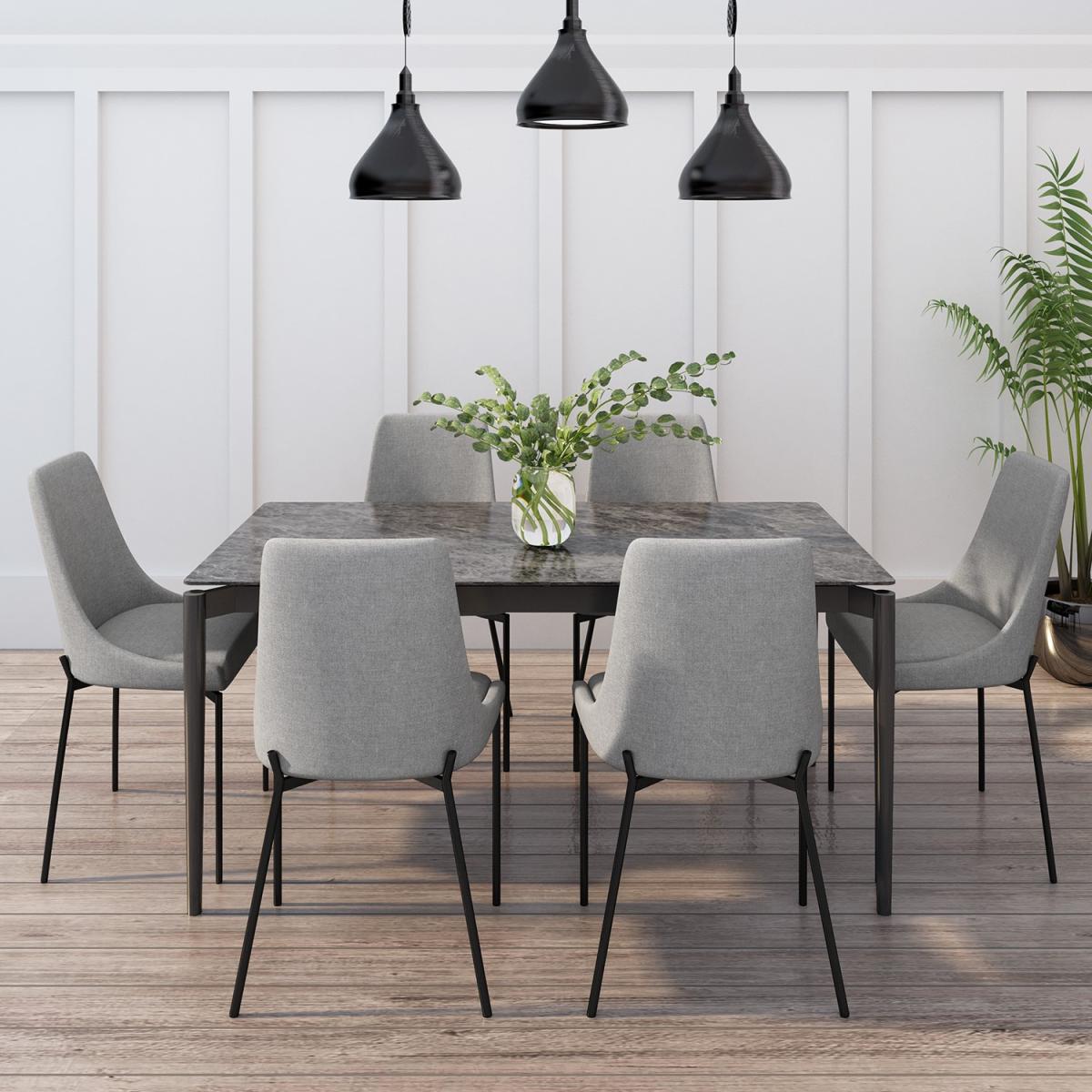This Bundle Includes1 x Camilla Extendable Grey Marble Dining Table6 x Camilla Grey Fabric Dining Chairs Dining Table Description Contemporary dining table with an extendable top Grey marble effect created with high-quality ceramic. Great for surprise guests and larger dinner parties. Stain scratch and heat resistant for style that lasts. Comfortably seats six people eight when extended. Also available in white in the Camilla range. Dining Table Information. Dimensions. H75.2 x W160 – 200 x D85cm Weight. 105kg Seats. 6 to 8 Colour. Midnight grey Finish. Matt stone lacquer with powder-coated metal legs Material. MDF glass ceramic and metal Assembly required. Yes Dining Chair Description Neutral grey fabric easily coordinates with many décor schemes. Tall chair back offers comfortable support. Sleek and modern look. Elegant tapered chair legs with a black finish. Wide variety of coordinating tables available. Dining Chair Information. Number of chairs. 6 Dimensions. H91.5 x W43 x D54 cm Material. Fabric foam plywood and metal Finish. Neutral grey with dark grey powder coating legs Assembly required. Yes Range. Camilla..