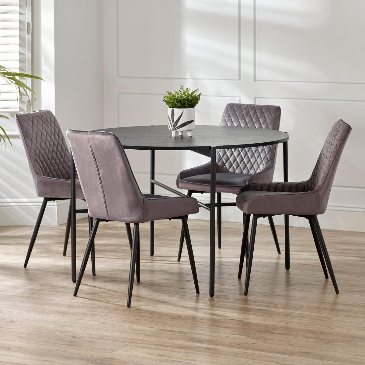 I’m a fan of how this four-seater’s slim black legs and softly grained top keep things feeling light yet grounded. Its clean lines suit minimalist, Scandinavian or industrial-inspired spaces, and the round shape works especially well in smaller dining nooks. For styling, try pairing it with mixed-tone upholstered chairs and a simple pendant light to draw the eye upward. Keep tableware in soft neutrals or muted pastels and add a low green centrepiece or sculptural vase. A textured rug underneath will define the area without cluttering the look.