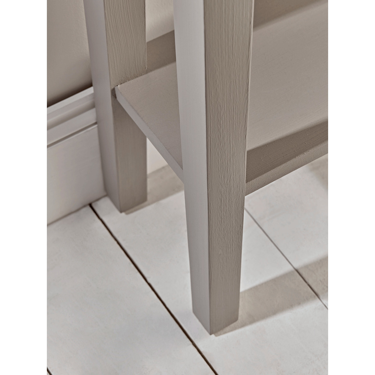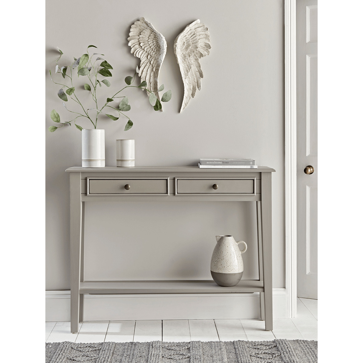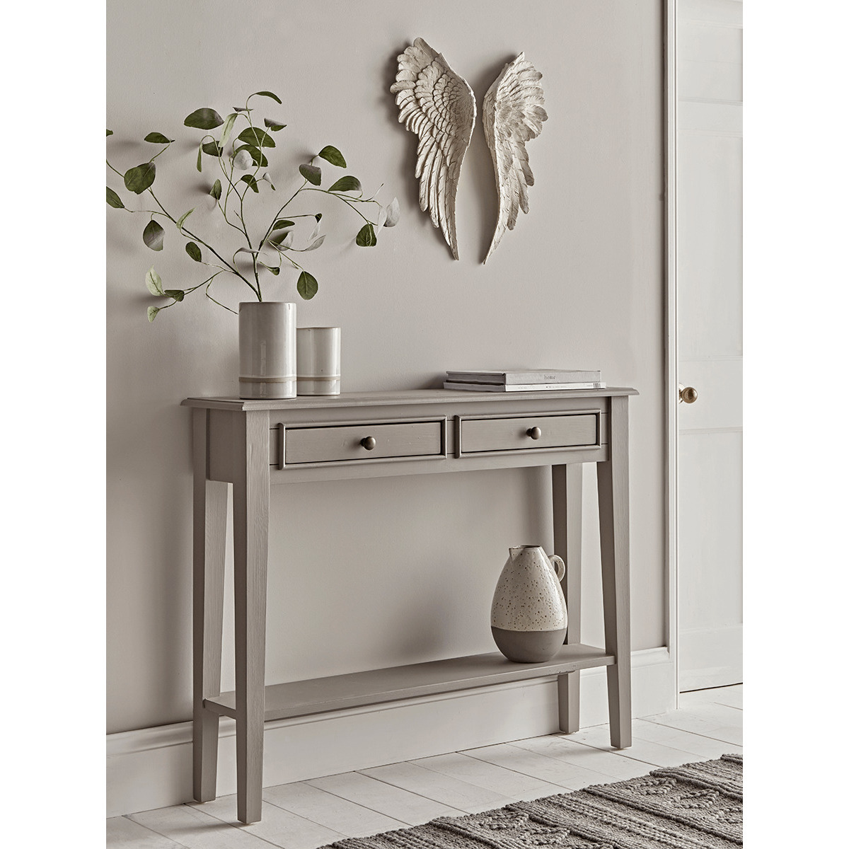 With a warm grey painted finish and two slender drawers with simple round metal handles, our elegant Camille console is the perfect way to store essentials in your hallway or lounge. Each has a handy shelf for extra storage, and fits snugly against your wall. Also available as a Bedside Table and Chest of Drawers.