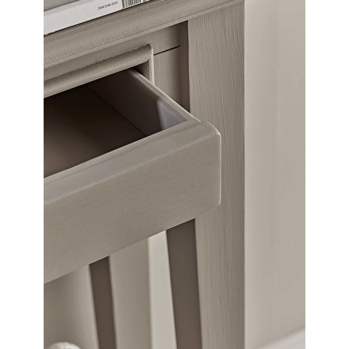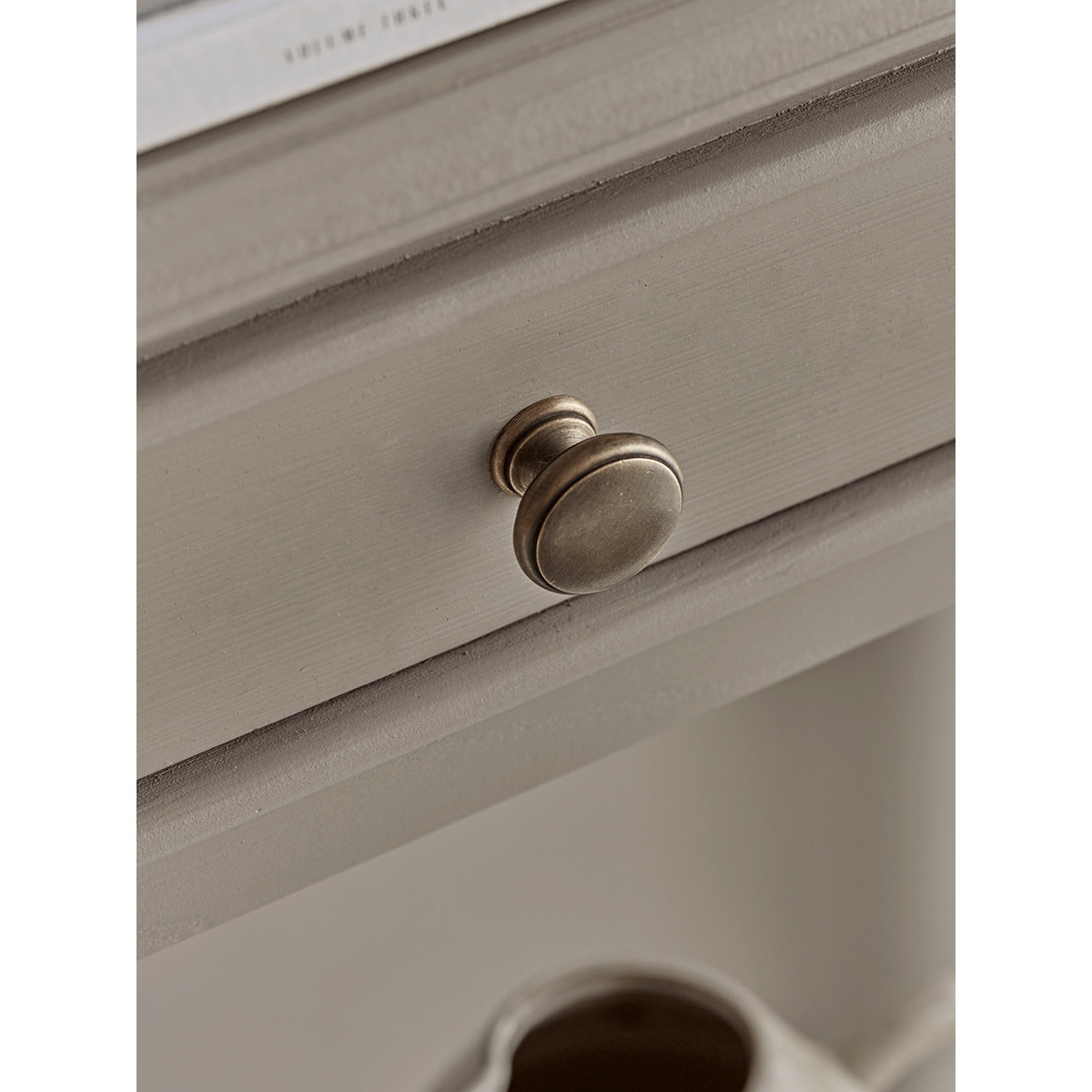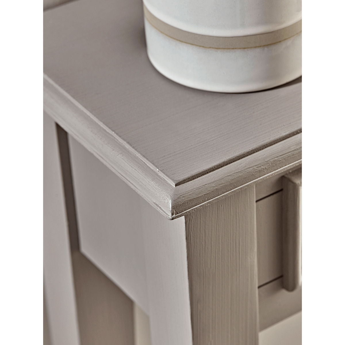 With a warm grey painted finish and two slender drawers with simple round metal handles, our elegant Camille console is the perfect way to store essentials in your hallway or lounge. Each has a handy shelf for extra storage, and fits snugly against your wall. Also available as a Bedside Table and Chest of Drawers.