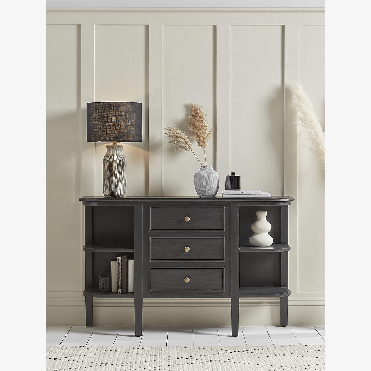 I’m a fan of the Camille console for its neat proportions and blend of closed drawers with open shelving - it’s slim enough for a hallway yet offers decent storage. The matte black finish and brass knobs make it equally at home in modern-industrial, transitional or pared-back Scandi schemes. For styling, lean a large mirror or slim artwork above to draw the eye up, then layer a textured table lamp, a small plant and a couple of ceramics on top. Tuck woven baskets or books into the lower shelves to keep things organised and swap accessories seasonally to keep the look fresh.