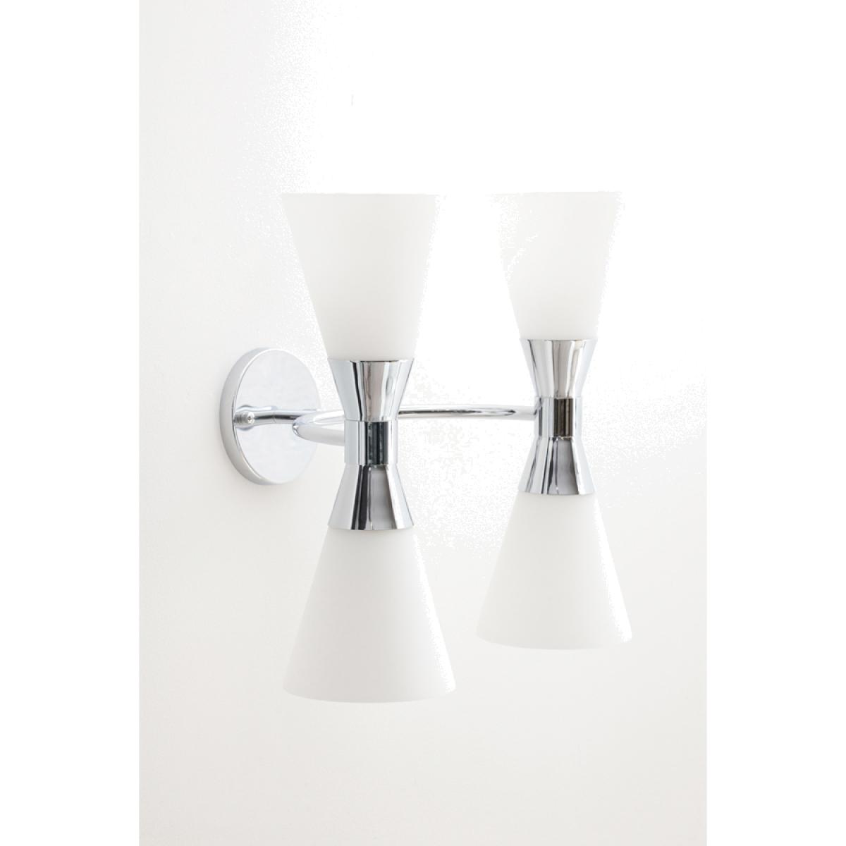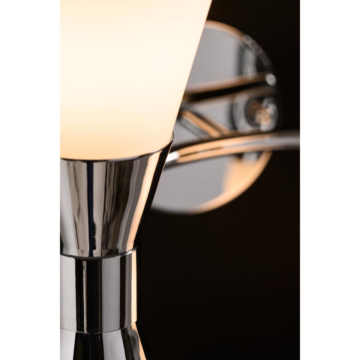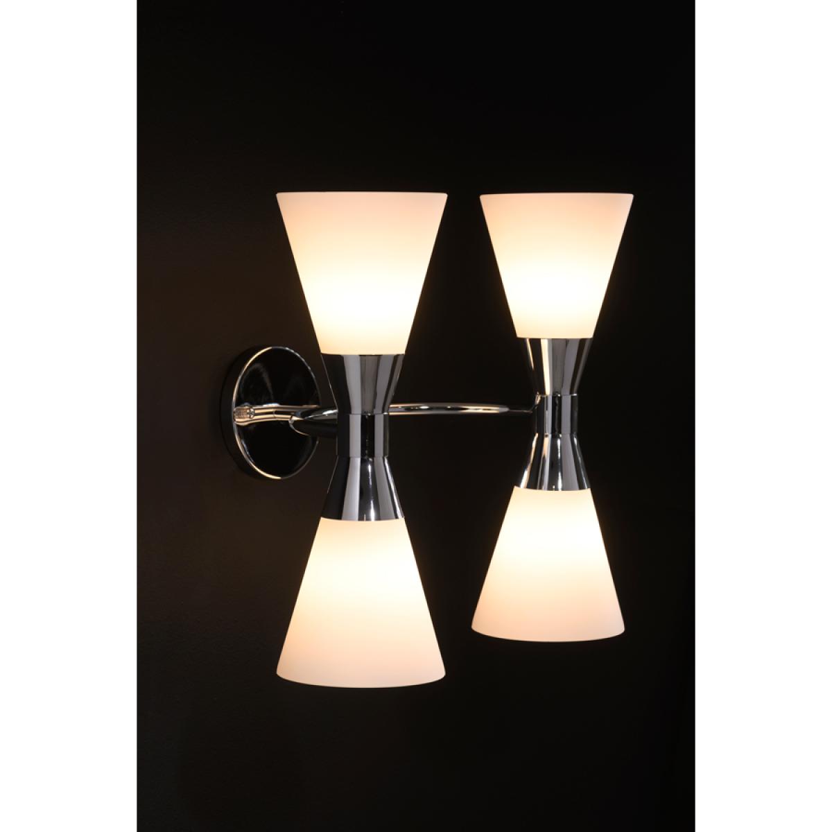 A characterful, feminine wall light Sculptural frosted glass diffusers to create a soft ambient light effect Stainless steel metal detail with polished chrome finish Perfect to display in pairs Supplied with 4 x E14 LED non dimmable bulbs