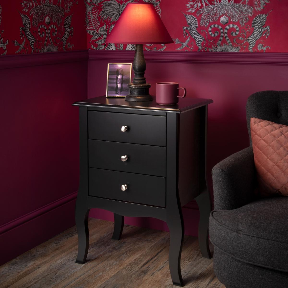 I’m a fan of this slimline Camille side table in black for its neat footprint and gently curving legs, which add just the right amount of grace without overwhelming a room. The matte finish makes it easy to slot into both contemporary and more traditional schemes, from monochrome minimalism to jewel-toned boudoir corners. Styling tip: pair it with a small statement lamp and a stack of art books, then finish with a ceramic vase or brass tray to catch keys and loose change. It also works brilliantly as a bedside or occasional table - its three drawers keep clutter out of sight while the top remains a tidy display zone.