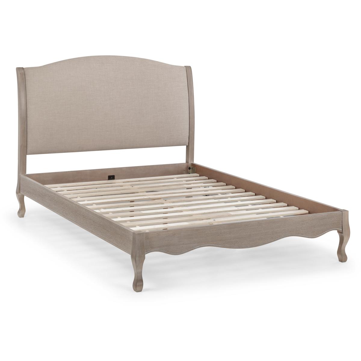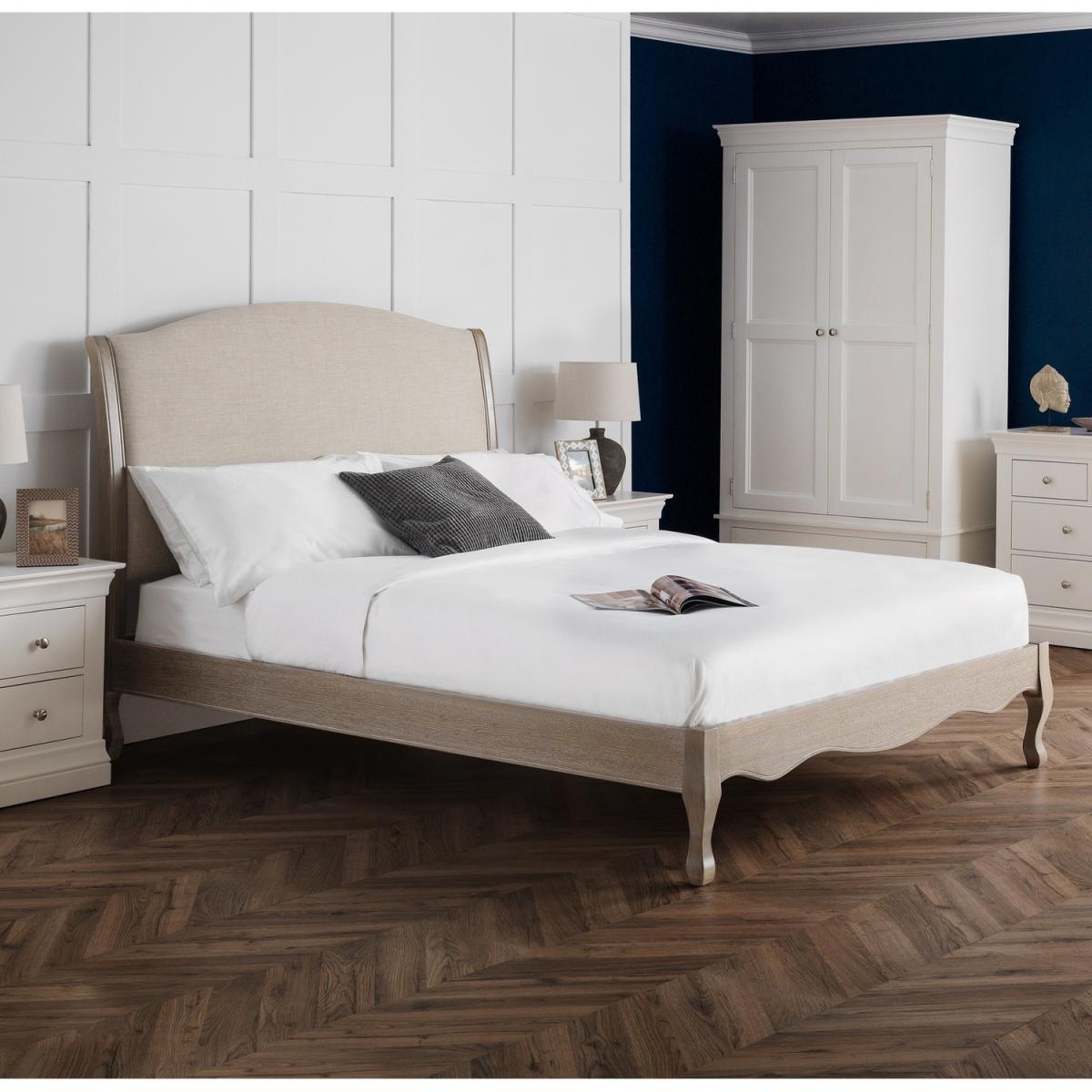 Inspired by a classic French design, the Camille bed excels in elegance. Featuring traditional ornate details, from the curved and arched headboard to a scalloped footboard with cabriole legs, this bed is the definition of a timeless design. The frame is finished in a limed oak effect, with a soft upholstered headboard covered in an oatmeal linen fabric. The Camille Bed is available in 135cm Double, 150cm King, and 180cm super king sizes.