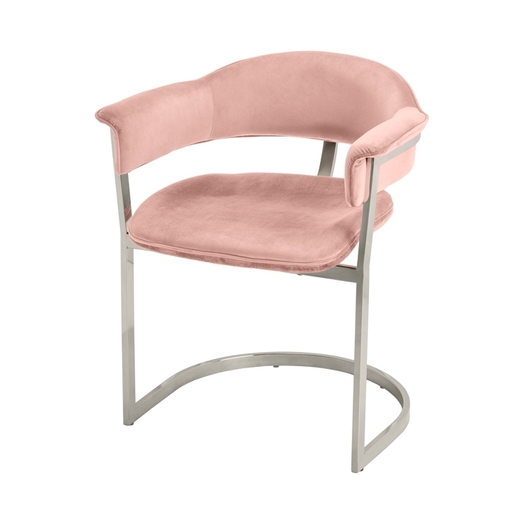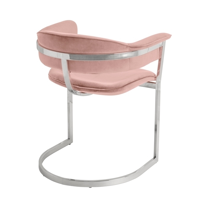 A sculptural contemporary dining chair inspired by highly collectible American mid-century furnishings Stainless steel frame with mirror polished finish Velvet upholstery fabric