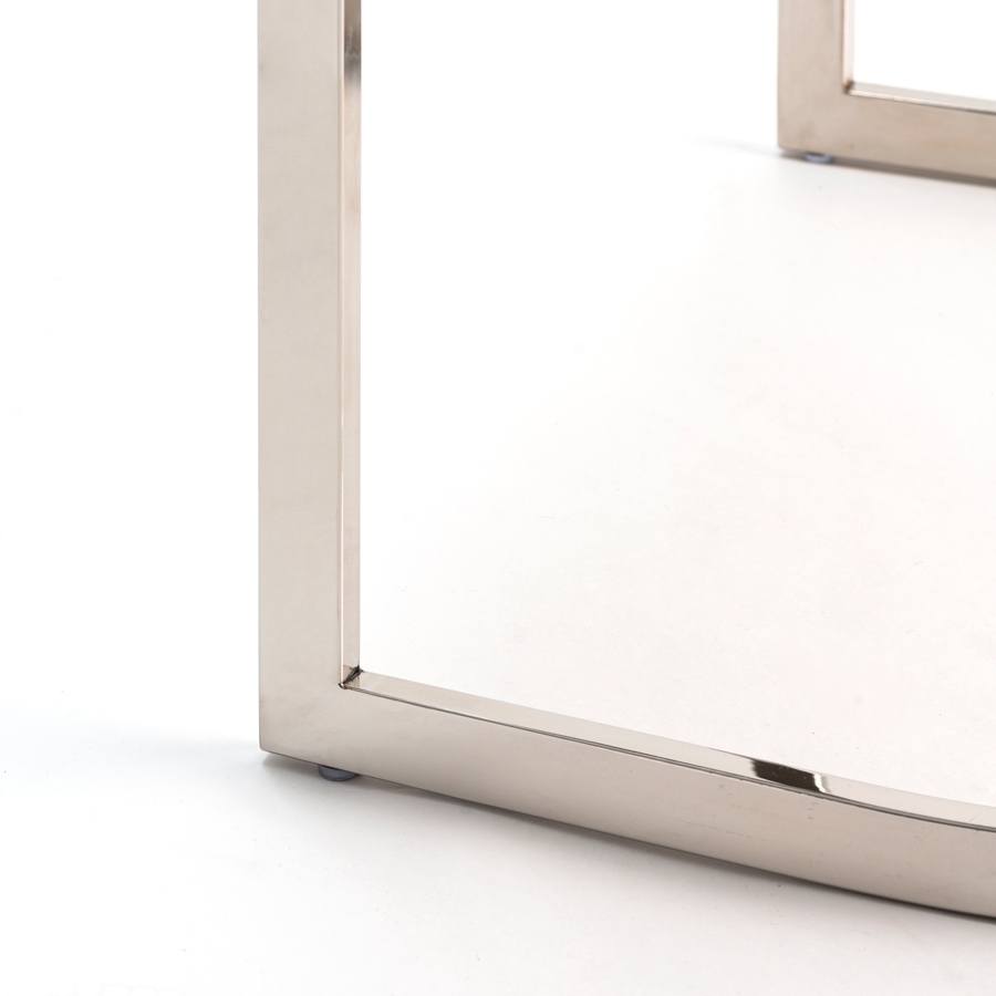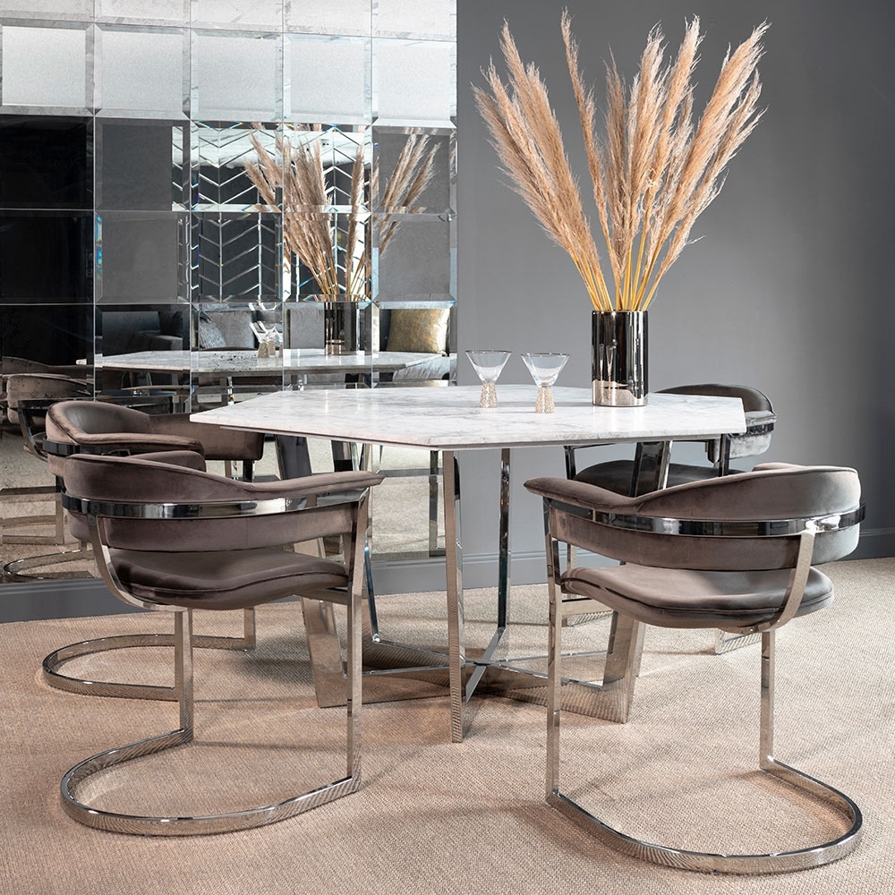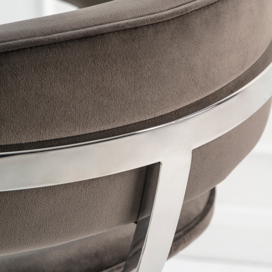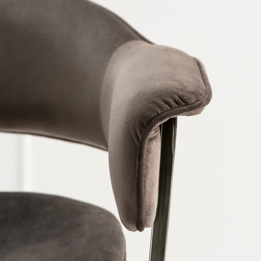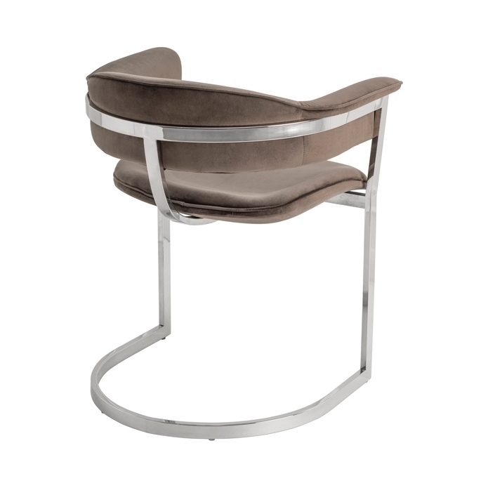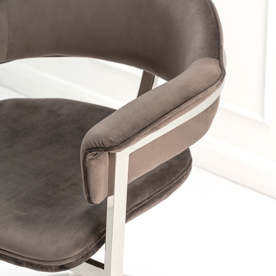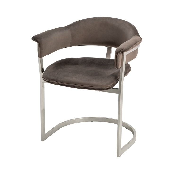 A sculptural contemporary dining chair inspired by highly collectible American mid-century furnishings. Stainless steel frame with mirror polished finish. Velvet upholstery fabric.
