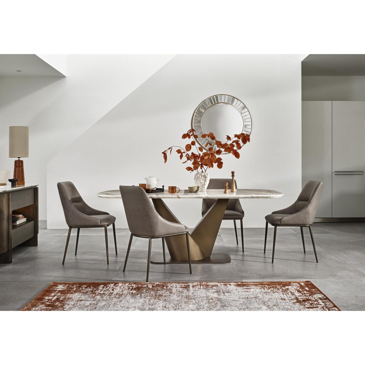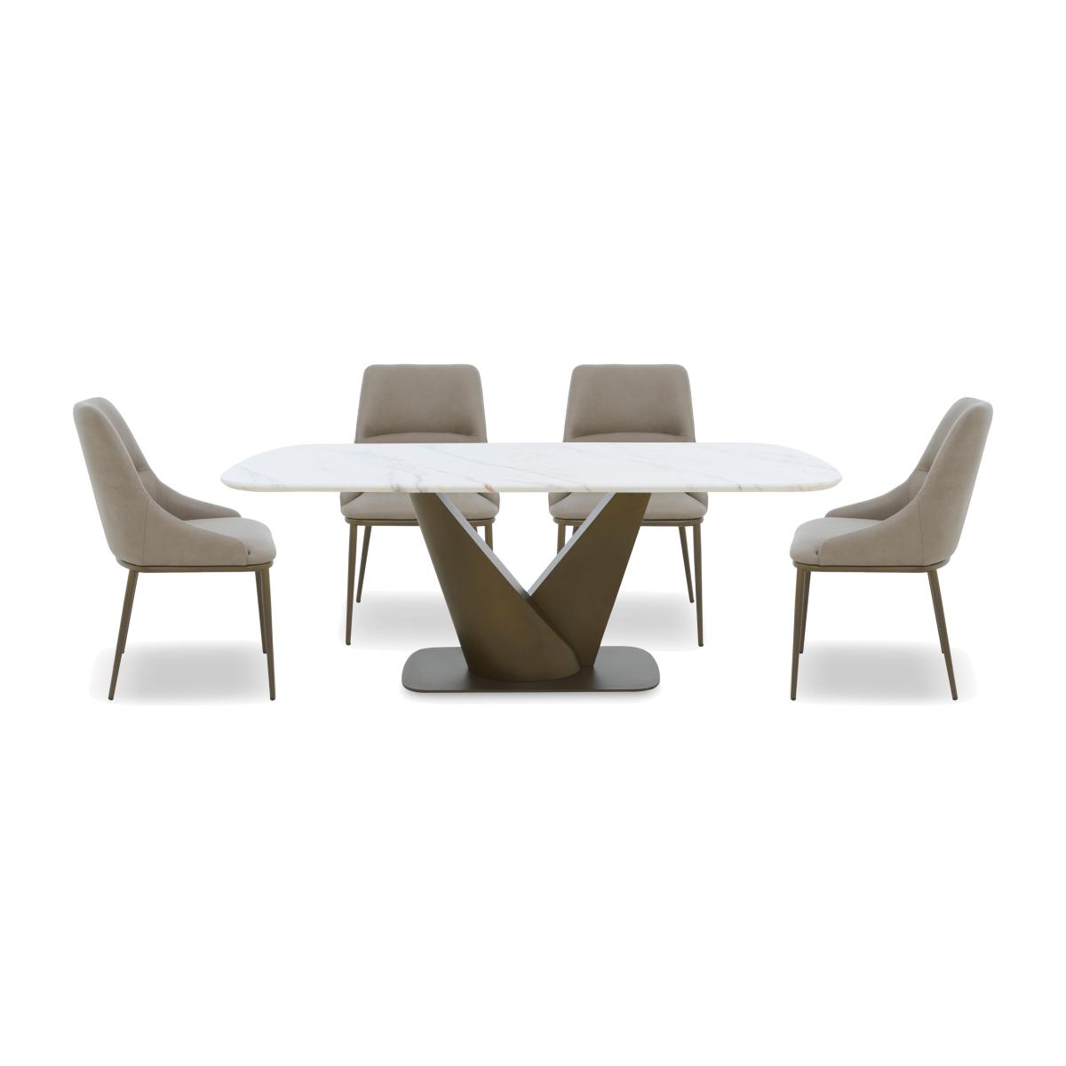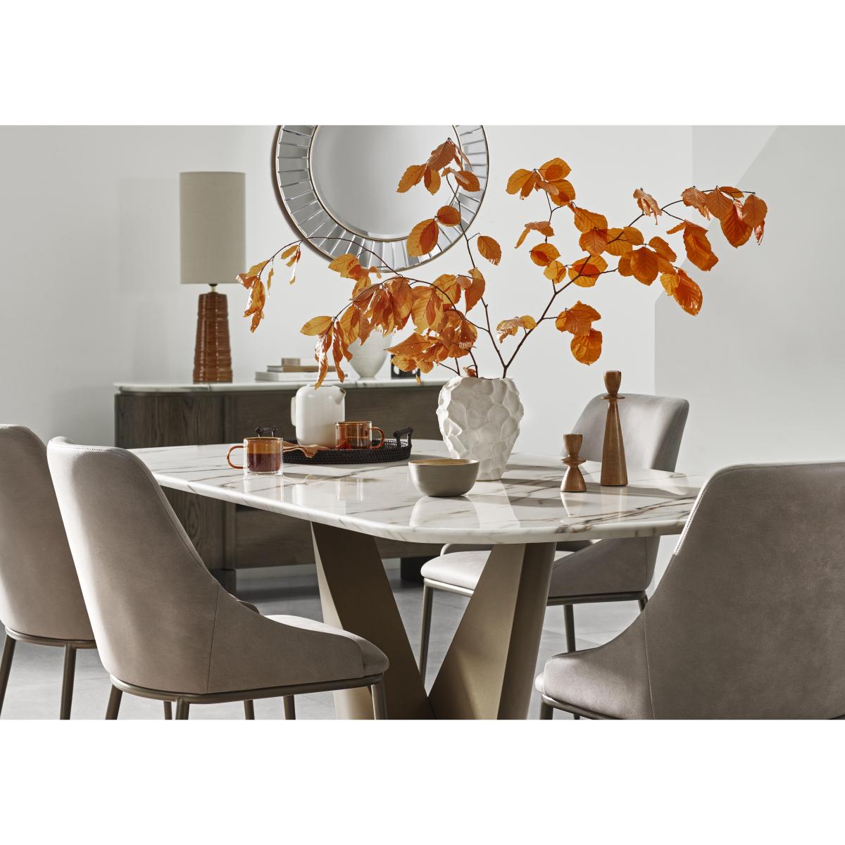 Gorgeous, glossy and glam, the furniture in our Camino range features innovative and creative design touches that underscore its inherent luxury style. The refined marble tops have all the unique charm of authentic marble applied to hardwearing ceramic, and are heatproof, scratch-resistant and chip-resistant. Glossy metal table bases and wood veneer frames are designed to catch the eye while underpinning the glam style of the collection’s dining tables, living room tables and storage furniture. Contemporary style touches abound in the bevelled edges of ceramic tops, round profiles of storage cabinets and the sideboard with built-in alcove lighting. The Camino range is exclusively available at Furniture Village. The beauty of marble meets long-lasting durability. The dining table in our glam, high-gloss Camino dining set has a refined marble and ceramic top and a metal pedestal base. With four dining chairs. Why you'll love it All glamour. All gloss. All gorgeous luxury style. Our stunning high-gloss Camino dining set will transform your dining room. The dining table’s refined marbled surface is hand-applied to ceramic. This painstaking process ensures a beautiful and consistent finish. Plus, it’s heatproof, scratch-resistant and chip-resistant. The top’s rounded bevelled edge adds to the contemporary glam look. Metal frame and striking V-shaped pedestal base have a stylish bronze finish. Available in 2 sizes to seat up to 8 and 10. With a set of 4 curvaceous and sumptuously cushioned dining chairs. Chairs are fully upholstered in taupe faux leather. Slender mental legs and frame have a luxe bronze finish. Only at Furniture Village. This dining set is part of our Camino range. What you need to know Chairs have metal frames and legs and are cushioned with foam. 220 cm dining table seats 10. 180 cm dining table seats 8. We recommend using coasters and placemats at all times. Easy to care for. Simply wipe with a clean, slightly damp cloth. Item code: CAMIDSET1-001
