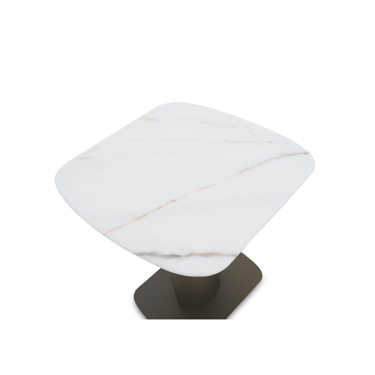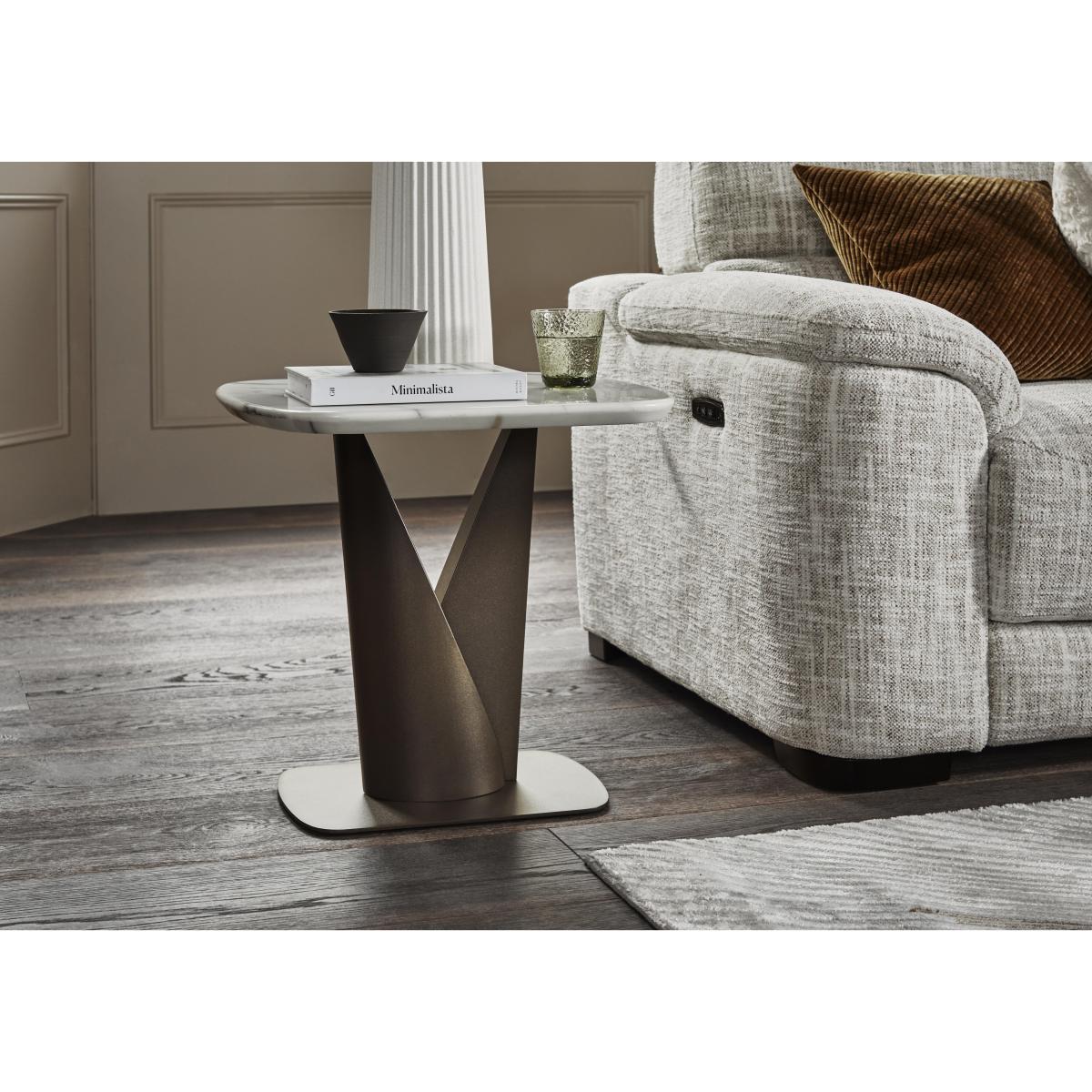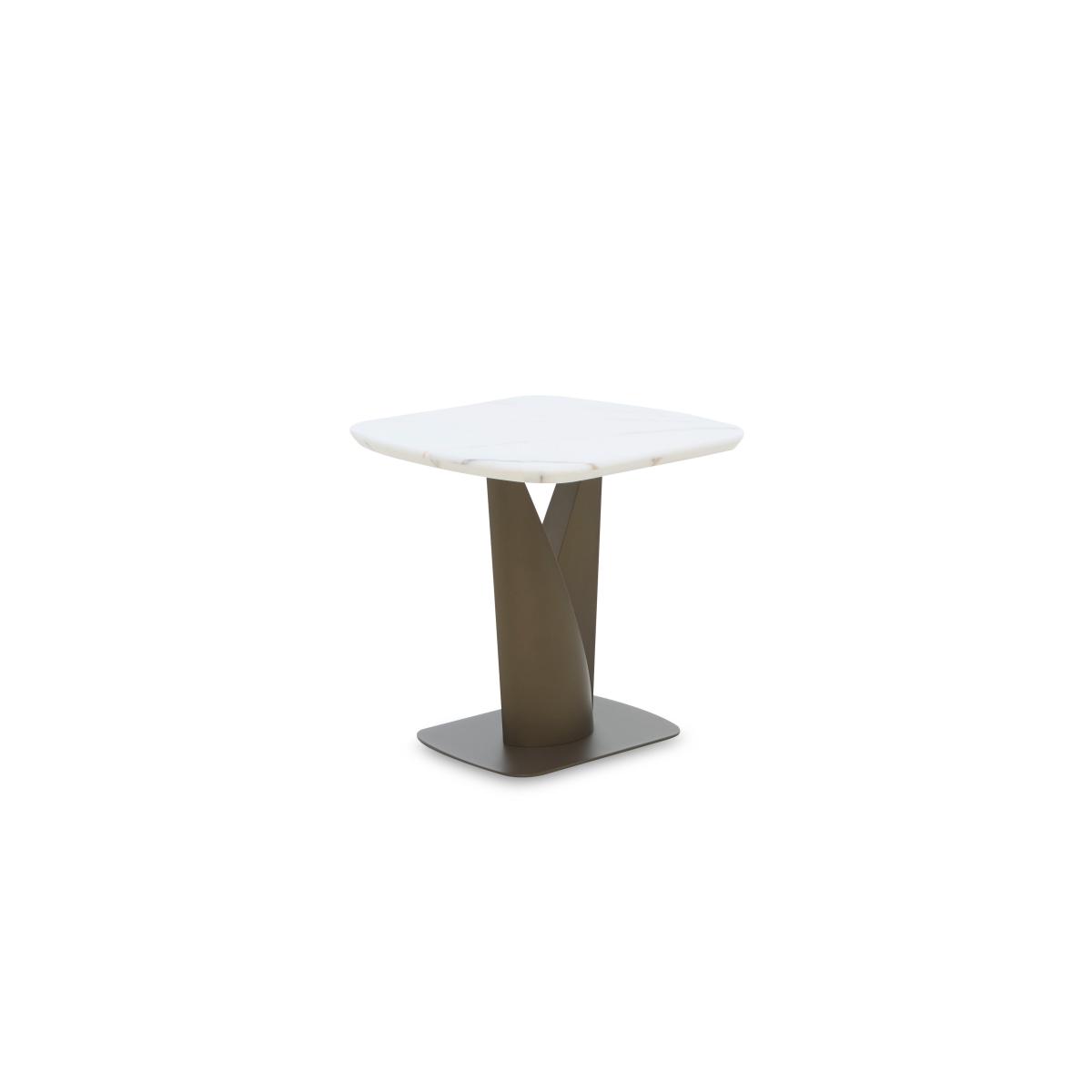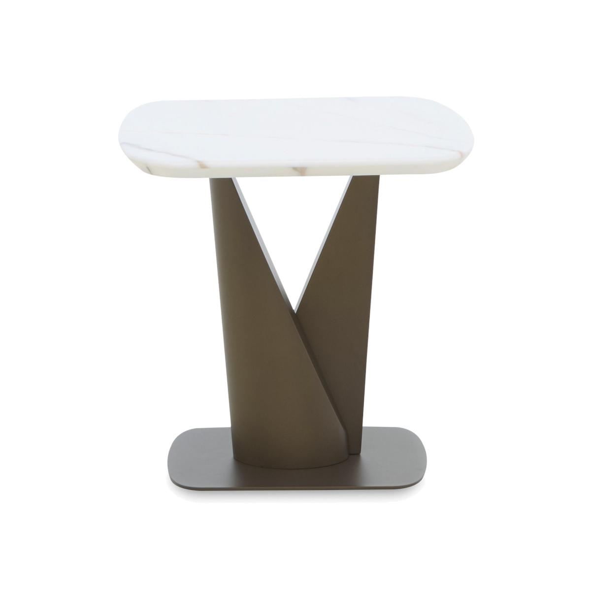 Gorgeous, glossy and glam, the furniture in our Camino range features innovative and creative design touches that underscore its inherent luxury style. The refined marble tops have all the unique charm of authentic marble applied to hardwearing ceramic, and are heatproof, scratch-resistant and chip-resistant. Glossy metal table bases and wood veneer frames are designed to catch the eye while underpinning the glam style of the collection’s dining tables, living room tables and storage furniture. Contemporary style touches abound in the bevelled edges of ceramic tops, round profiles of storage cabinets and the sideboard with built-in alcove lighting. The Camino range is exclusively available at Furniture Village. The beauty of marble meets long-lasting durability. Our glam, high-gloss Camino side table has a refined marble and ceramic top and a simply stunning bronzed-toned metal pedestal base. Why you'll love it All glamour. All gloss. All gorgeous luxury style. Our stunning high-gloss Camino side table will transform your dining room. The refined marbled surface is hand-applied to ceramic. This painstaking process ensures a beautiful and consistent finish. Plus, it’s heatproof, scratch-resistant and chip-resistant. The top’s rounded bevelled edge adds to the contemporary glam look. Metal frame and striking V-shaped pedestal base have a stylish bronze finish. Only at Furniture Village. This side table is part of our Camino range. What you need to know We recommend using coasters and placemats at all times. Easy to care for. Simply wipe with a clean, slightly damp cloth. Item code: CAMISTBL--001