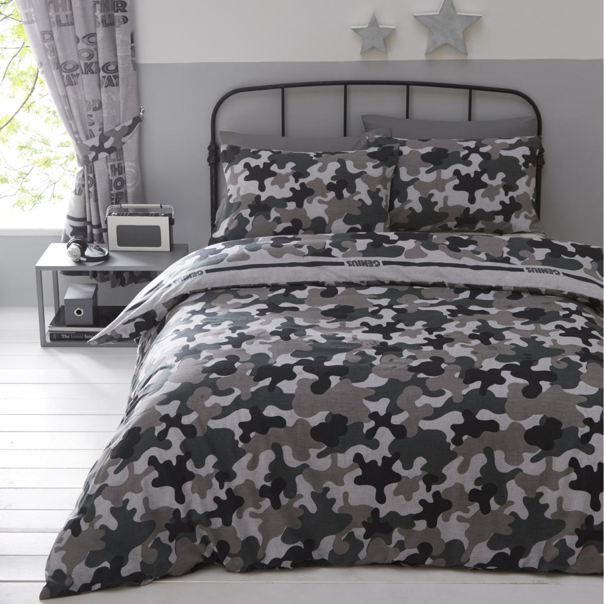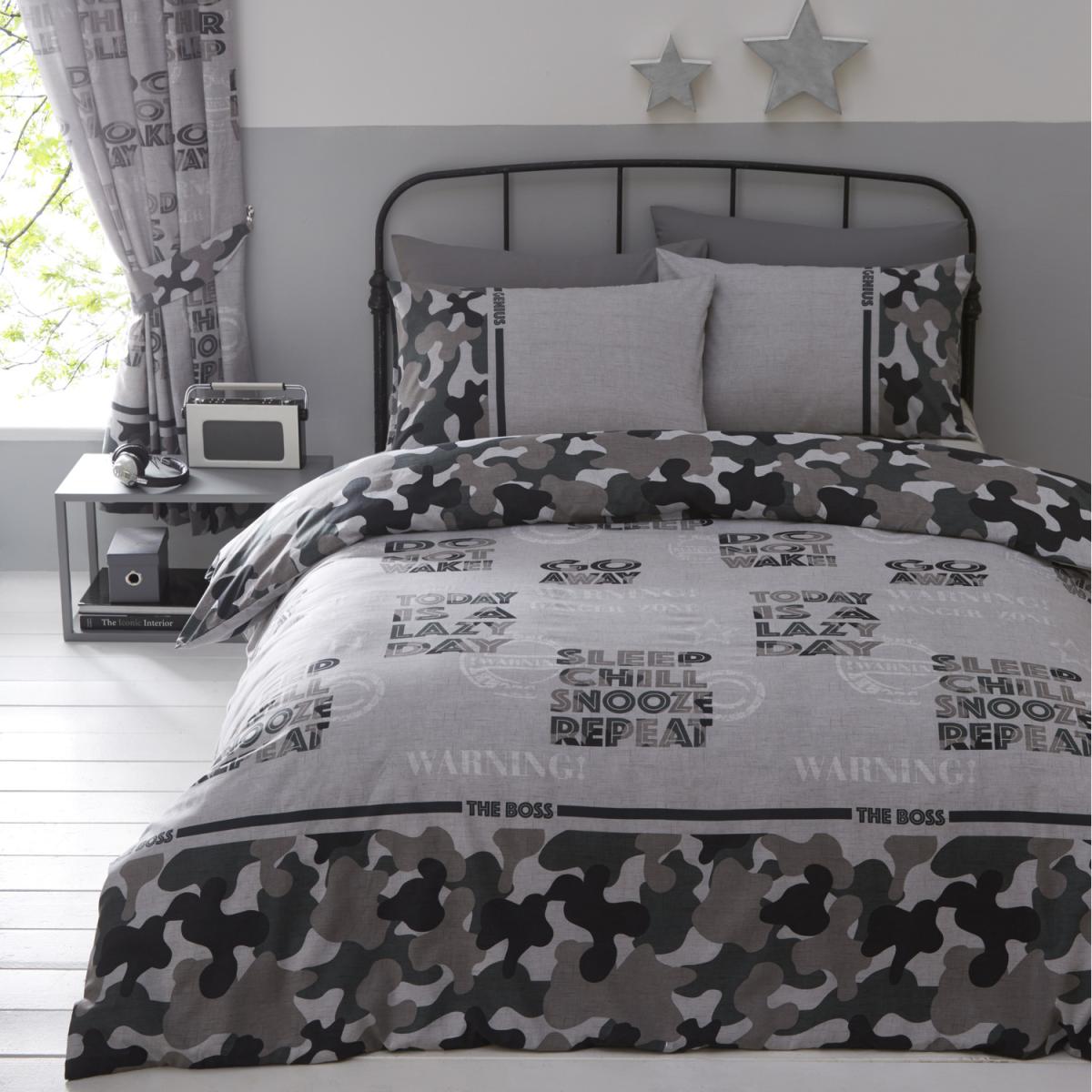 Sleep, chill, snooze, repeat with this army-inspired junior bedding, comprising of fun quotes layered onto top secret agent motifs on a soft grey textured backdrop, bordered by traditional muted grey and green camouflage. The reverse offers an all-over camouflage pattern and pencil pleat curtains complete the look.