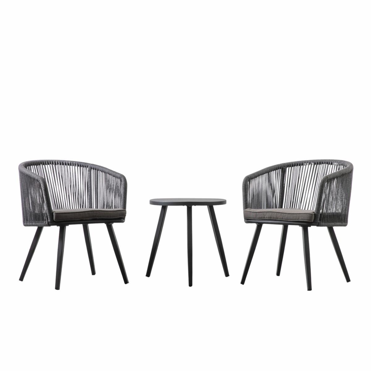 This lovely 2 Seater Bistro/Tea Set offers two chairs and a side table, making it ideal for smaller spaces and cosy garden corners. The table and chair frames are made from powder coated aluminium, with weatherproof rope weave for the chair seats and showerproof scandi-style cushions in a coordinating colour for added comfort. A matching dining set is also available. Material: Aluminium. Colour: Grey.