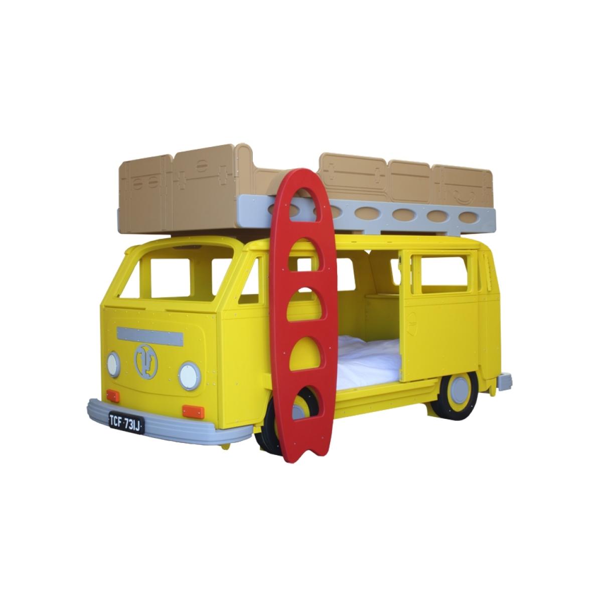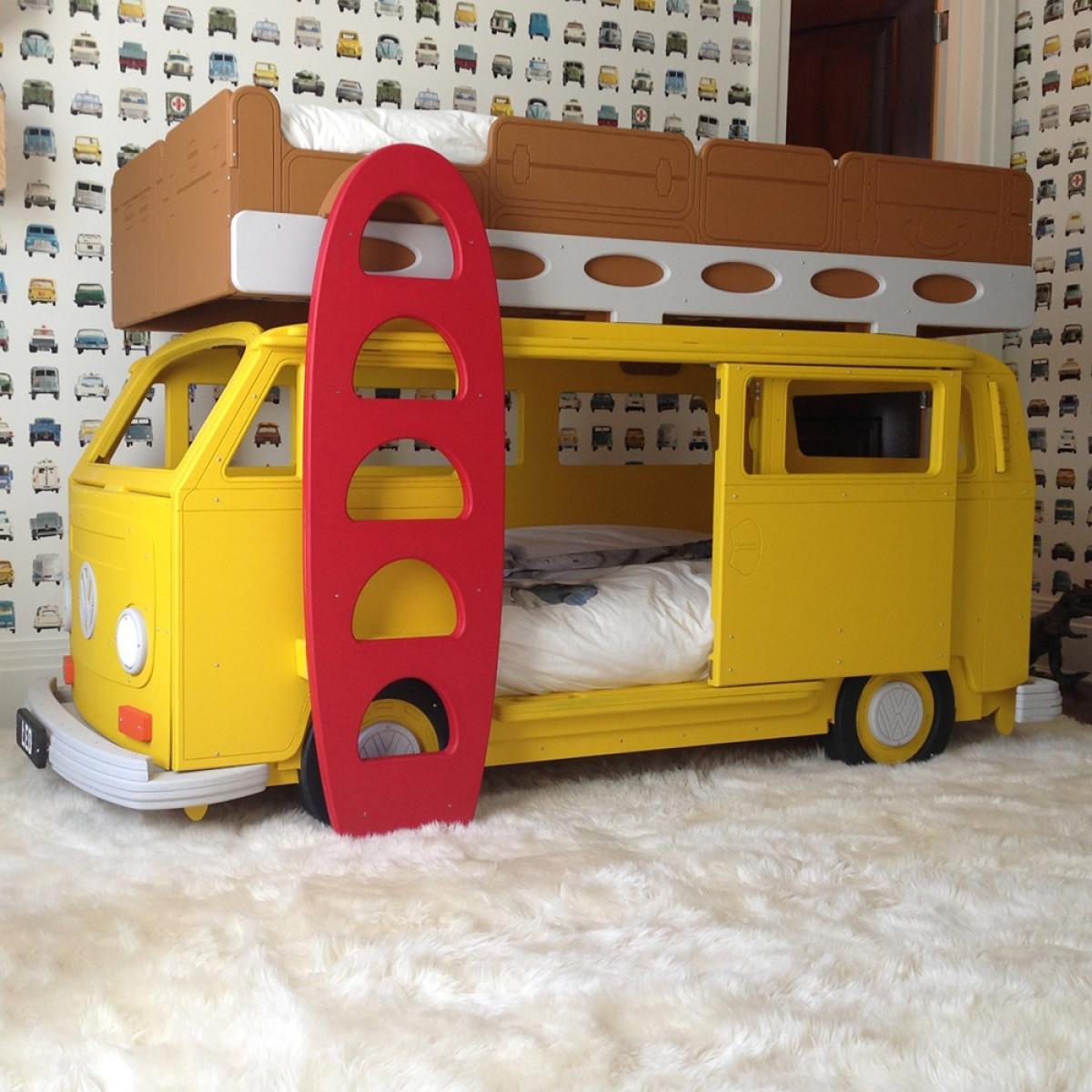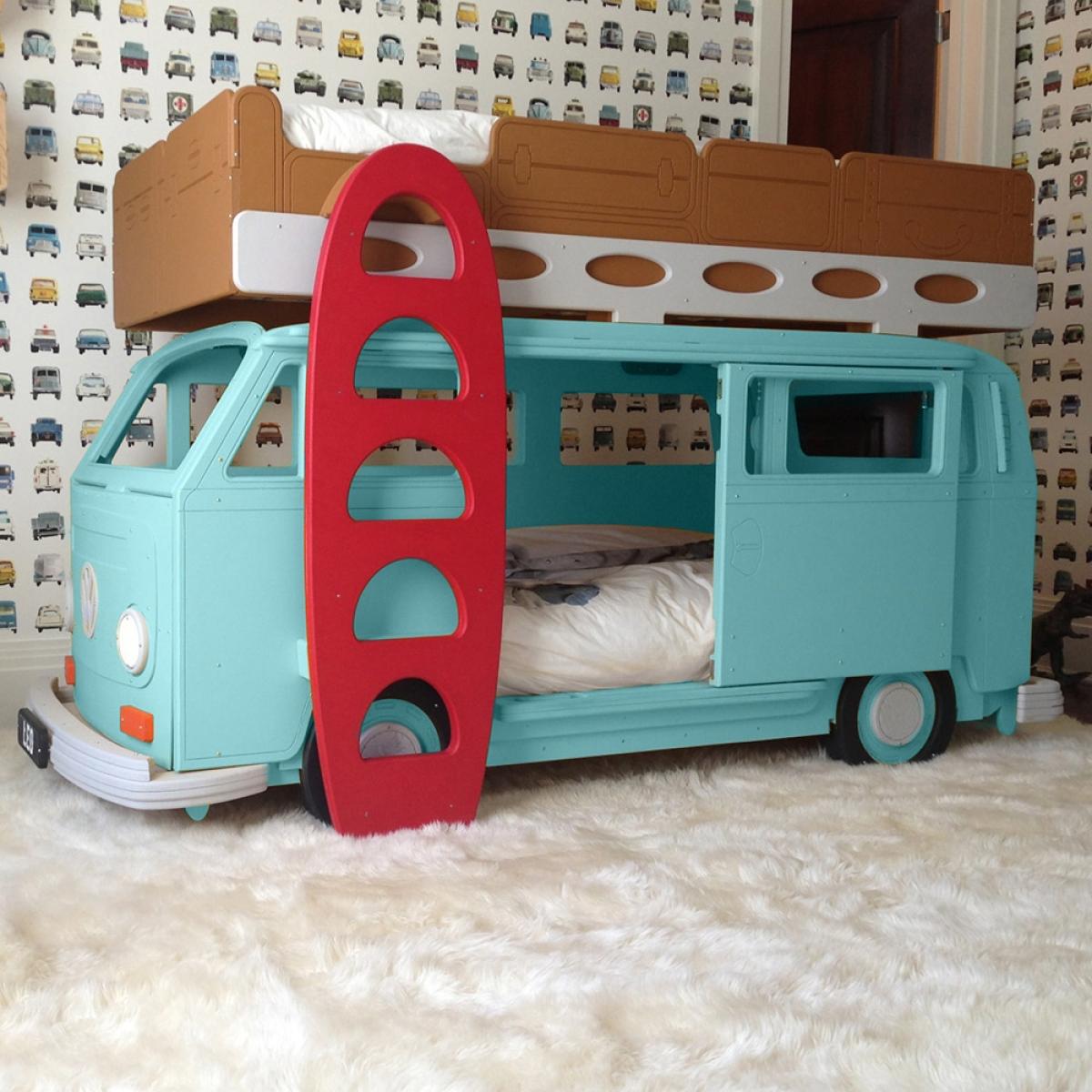 The Camper Van Bay Children's Bunk Bed is simply AMAZING! Hand made in England by a family firm, the Camper Van Bunk Bed features a door which shuts, surfboard style ladder and very accurate detail. This cool kids bed fits a standard single mattress (190 x 90cm). This unique kids bed is available in a huge selection of colours (available on request including a 3D image in the colour of your choice). Features and benefits:.