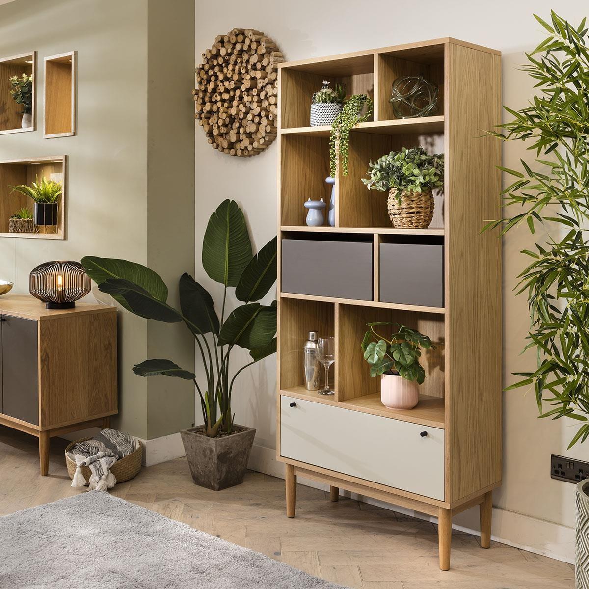 Storage is no longer just about storage. As well as functionality, it now has character and style, and enhances the look of the room. Exactly as this Campton bookcase does. Crafted with the finest materials, the shelving unit has a solid frame with oak veneer and MDF elements for durability and modern appeal. With an abundance of open shelves, it's perfect for showcasing your favourite books, decor pieces, or collectibles, adding a touch of sophistication to any room. The inclusion of two storage boxes in a chic taupe finish offers discreet organisation, while the drawer with a sleek light grey hue provide additional storage space for smaller essentials. The bookcase's beautiful light oak body, accentuated by taupe and light grey highlights, exudes a modern yet warm aesthetic. Supported by stylish legs, this piece effortlessly elevates any space, whether it's a cosy living room or a minimalist office. This is a self-assembly product - full assembly required W80cm D35cm H180cm Drawers internal dimensions 22 x 76 x 27 cm Leg Height 17cm