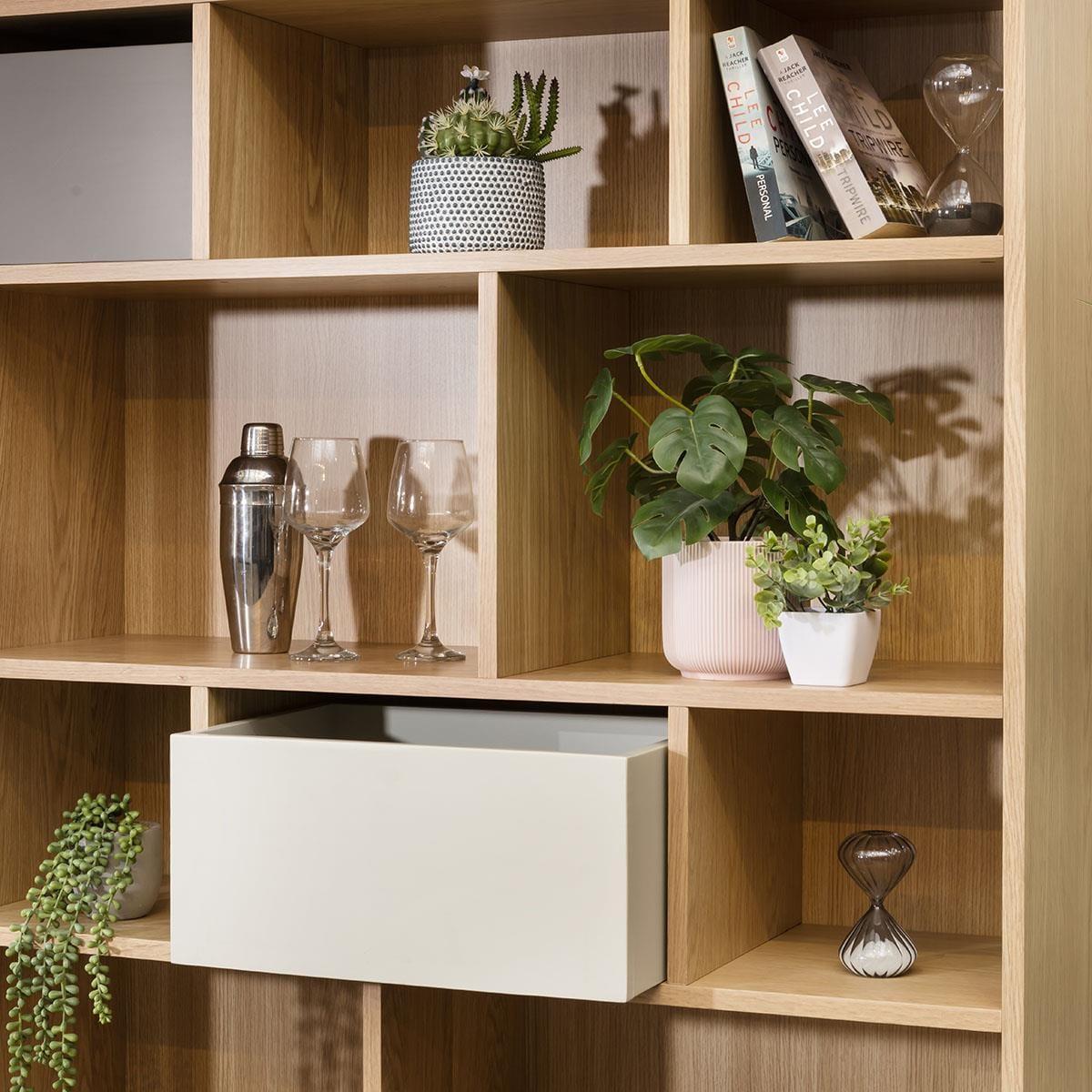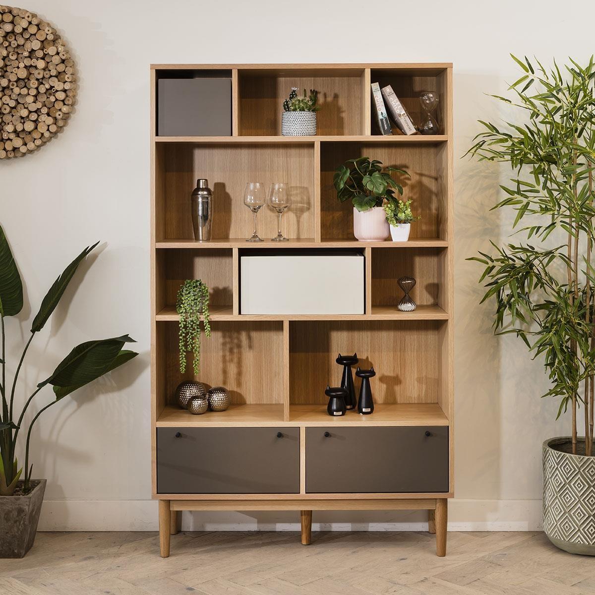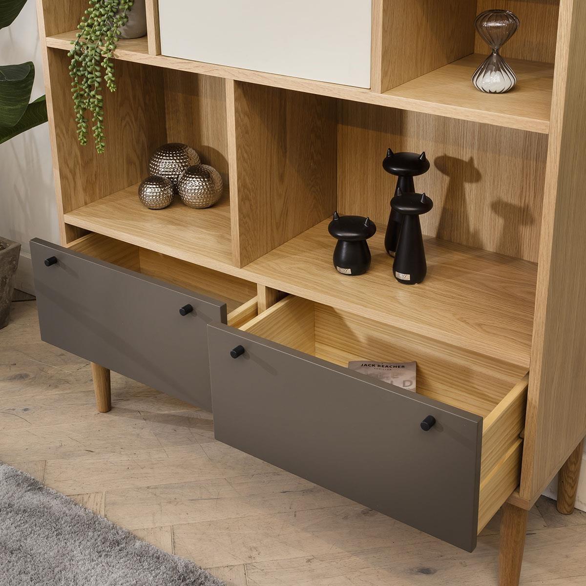 Storage is no longer just about storage. As well as functionality, it now has character and style, and enhances the look of the room. Exactly as this Campton wide bookcase does. Crafted with the finest materials, the shelving unit has a solid frame with oak veneer and MDF elements for durability and modern appeal. With an abundance of open shelves, it's perfect for showcasing your favourite books, decor pieces, or collectibles, adding a touch of sophistication to any room. The inclusion of two storage boxes offers discreet organisation, while two drawers with a chic taupe hue provide additional storage space for smaller essentials. The bookcase's beautiful light oak body, accentuated by taupe and light grey highlights, exudes a modern yet warm aesthetic. Supported by stylish legs, this piece effortlessly elevates any space, whether it's a cosy living room or a minimalist office. This is a self-assembly product - full assembly required W110cm D35cm H180cm Two storage boxes Two spacious drawers