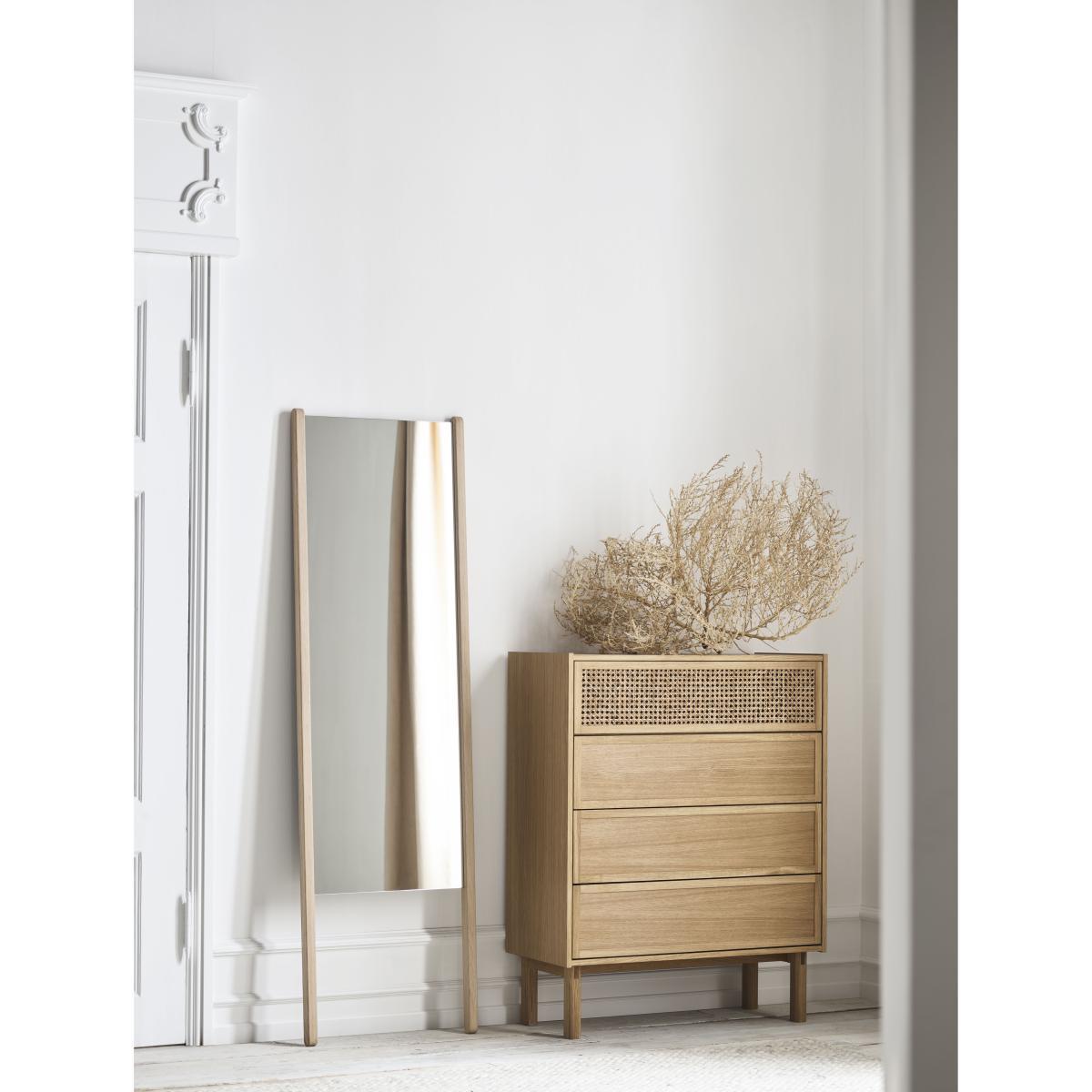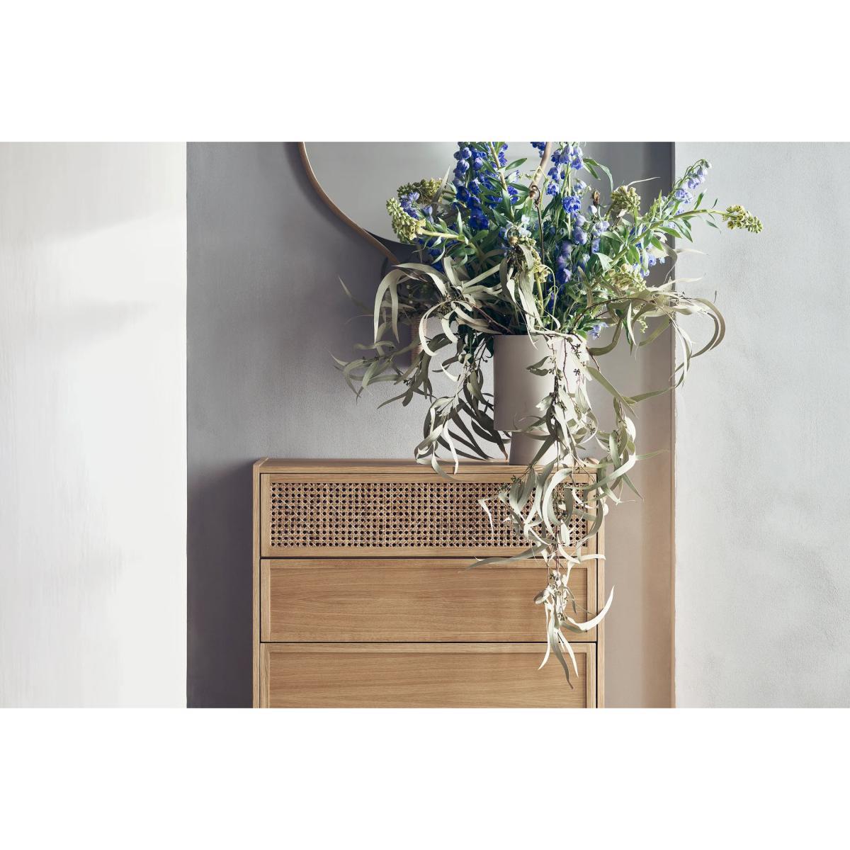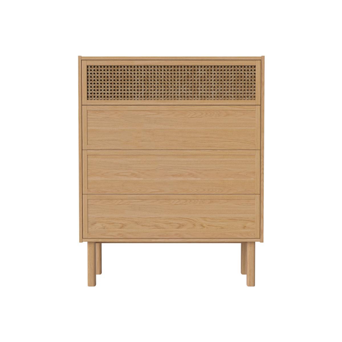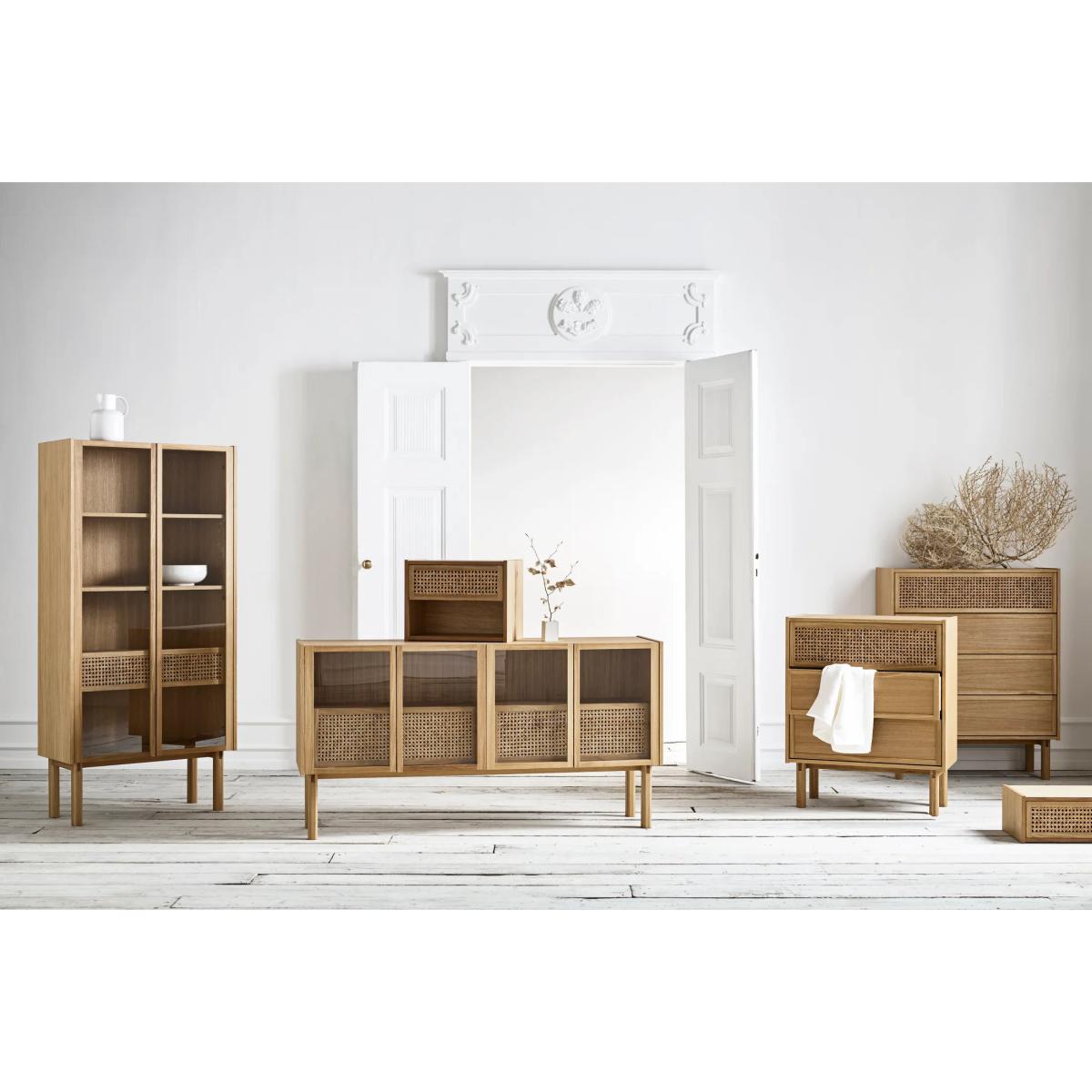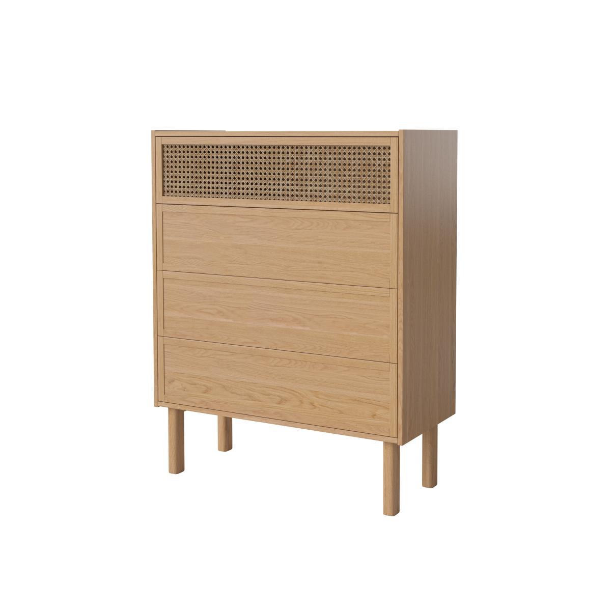 Natural simplicity for this elegant collection of furniture in natural oak veneer. Each model in the Cana series has a perforated, ethereal facade in rattan canework which gives it an authentic, airy appearance. Danish design duo Steffensen & Würtz were inspired by the tranquil, characteristic atmosphere of Danish seaside hotels, where serenity and authenticity create a very special atmosphere. The transparent, ethereal expression of the canework evokes this source of inspiration and elegantly recalls the functional and aesthetic advantage of a simple, clean, minimalist furnishing style. This chest of drawers is equipped with 3 drawers (in wood) and a drop-down door (in rattan canework). Each of the Bolia brand's creations is built to last and handcrafted by some of Europe's finest manufacturers. Bolia products are tested to the highest quality standards, and meet international and European standards for strength, durability, stability and safety. Natural materials take pride of place. The wood is FSC®-certified, which guarantees sustainable forest management and good working conditions. Passionate about the definition of the new Scandinavian design, the team of designers is entirely dedicated to creating new, inspiring, unique and original models.