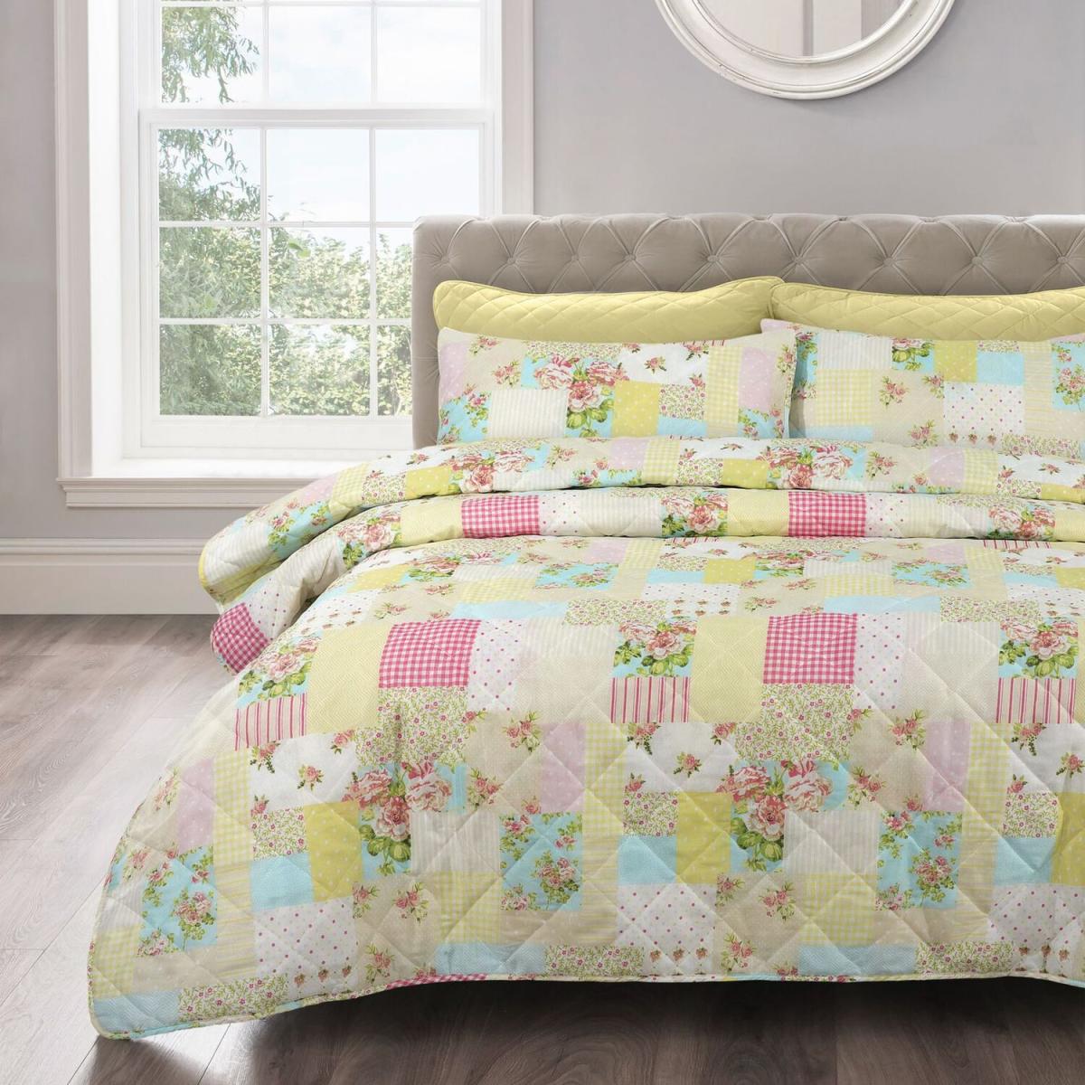 Carefully crafted with a combination of 50% polyester and 50% polycotton, this bedspread set offers a soft and durable fabric that ensures both quality and cosiness. The captivating multi-colour patchwork design adds a cheerful and eclectic touch to any bedroom decor. Designed for convenience, the Candice Patchwork Bedspread Set is incredibly easy to care for. It is machine washable, allowing for hassle-free maintenance and a consistently fresh appearance. The quilted construction not only enhances its visual appeal but also adds an extra layer of comfort, providing a cosy and inviting sleep experience. With its lightweight design, this bedspread set offers comfort without weighing you down. It is suitable for year-round use, providing just the right amount of warmth during colder nights and a breathable feel during warmer seasons. The reverse side, crafted from 100% polyester, adds an additional layer of softness and ensures a comfortable sleep surface. The Candice Patchwork Bedspread Set is not just a functional bedding accessory, but also a work of art. The patchwork design showcases a mix of colours, patterns, and textures, creating a visually striking focal point in your bedroom. Embrace creativity and comfort with the Candice Patchwork Bedspread Set, a perfect addition to your unique and vibrant home decor.