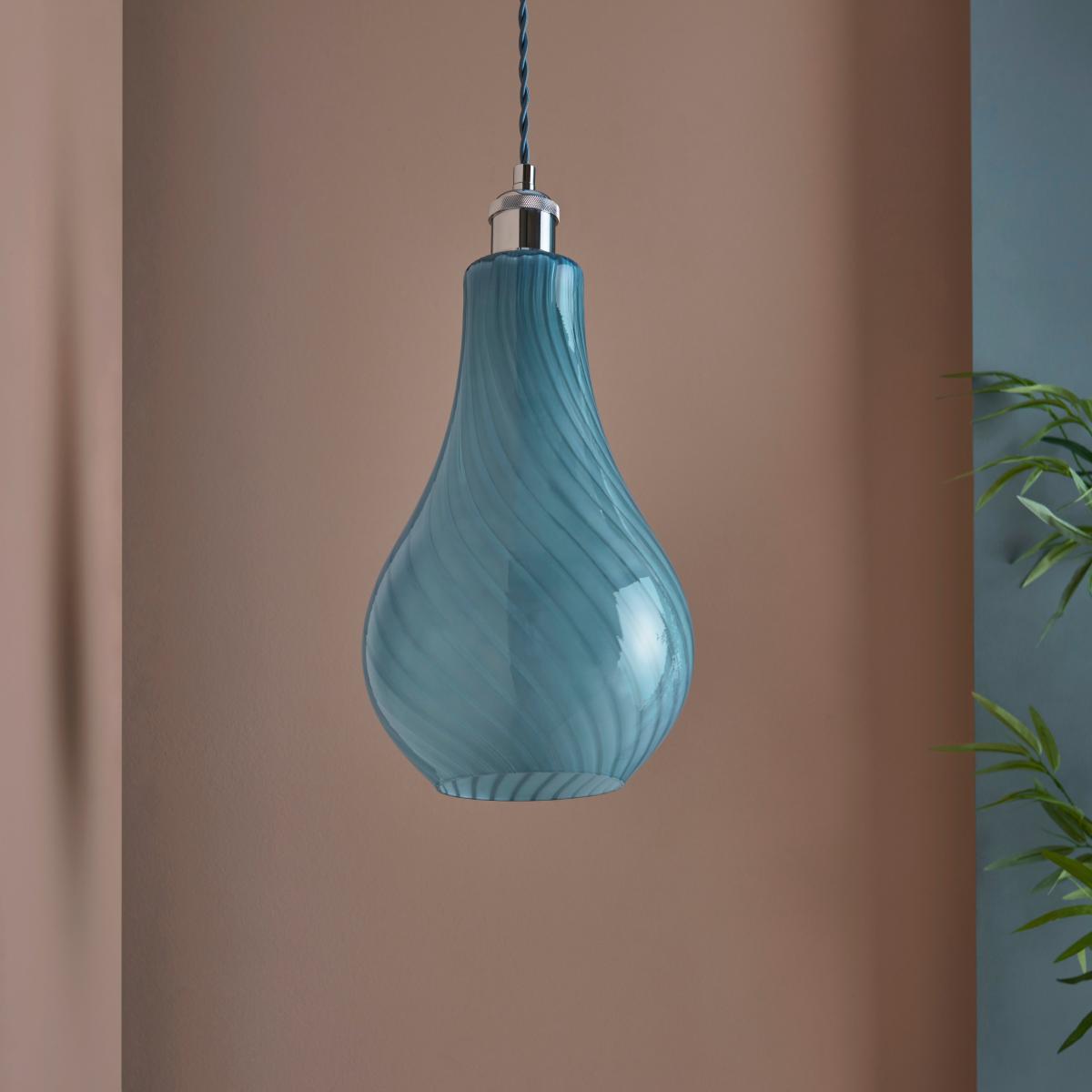 I love this pendant light for its playful yet refined design, making it a versatile piece for various interiors. Its soft blue hue and striped pattern add a subtle touch of colour and visual interest without overwhelming the space. It works particularly well in casual dining areas, family kitchens, or cosy boho-style rooms, where it can bring a fresh and approachable feel. Practical styling tips include hanging it at different heights in a cluster for a modern twist or pairing it with neutral tones to let the light’s colour and shape stand out. It’s a great option for those looking to add a pop of colour while maintaining a clean, contemporary aesthetic.