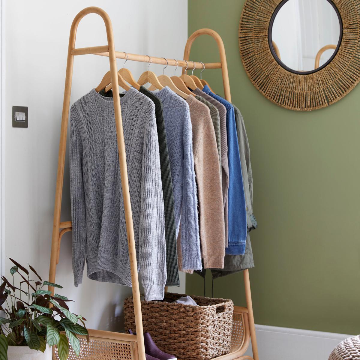 I love this bamboo clothes rail for its natural, understated look that adds warmth to a variety of interiors. It works particularly well in Scandi, boho, or coastal-inspired spaces, where the light wood tones enhance a relaxed, organic feel. Practical styling tips include using it to keep everyday clothing easily accessible or to display a curated selection of accessories and handbags. To keep the aesthetic cohesive, pair it with other natural materials like rattan or linen, and consider adding some decorative touches on the shelf or hanging a scarf or towel for added visual interest. It’s a versatile piece that combines functionality with style, perfect for creating a laid-back yet polished vibe.