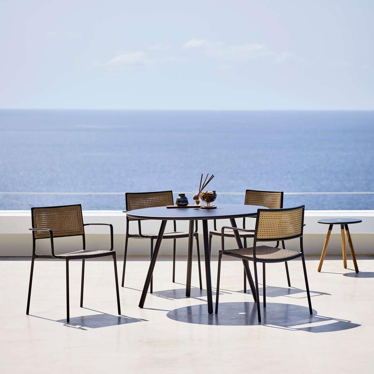 Design. The gorgeous. Cane-lin. E Area Garden Dining Table, Black. Is super sleek and contemporary. The sophisticated round-shaped aluminum. Top held by strong simple legs will suit a range of mode. Rn. Dining chairs. Finished in a classic power-coated black. ,. The Cane-line Area Garden Dining Table, Black. Will add elegance and style to your garden for many years to come.