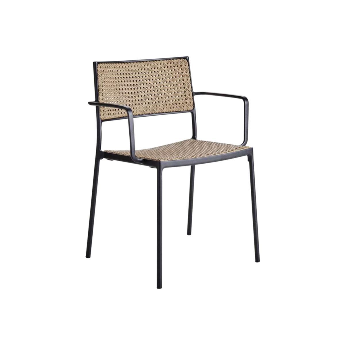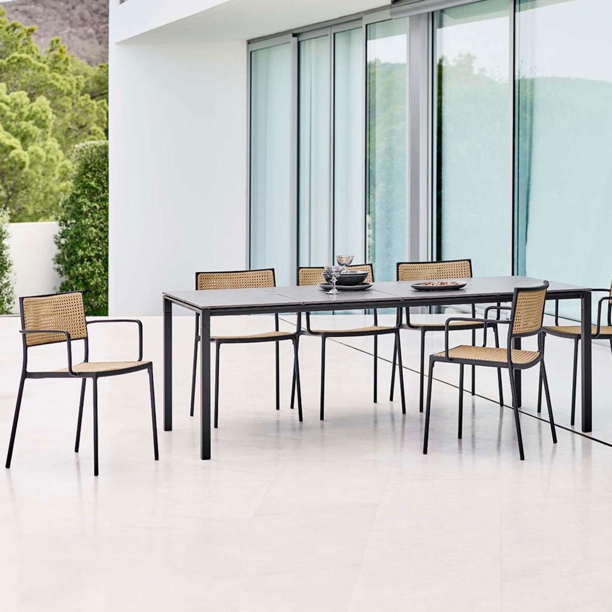 Design. Refine your. Indoor or. Outdoor space with the stylish and elegant Cane-line Less Stackable Armchair, French Weave, Na. Tural. The simple, minimalist. And stackable. Design is. Super diverse, suiting many different types of tables. And spaces. The seat and back. Display. The. Stunning. Cane-line French Weave. In natural,. Contrasting perfectly with the sleek black powder-coate. D aluminum frame. As wel. L as boasting beauty, this chair is practical too, weatherproof, long lasting and requiring very little maintenance.