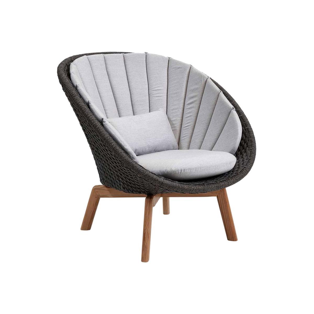 Design. The Cane-line Peacock Dark Grey Lounge Chair with Cushion Set. Is a uniquely beautiful piece that will transform your modern outdoor setting. Into a place you’ll never want to leave. The stylish and clever design crafted from Cane-line Soft Rope is extremely high in comfort. And can be used in any climate, being both temperature and UV-resistant. The teak legs. Add a warm, inviting glow and it’s complete with a. Stunning cushion set, available in different colors and fabrics. Explore the choice of configurations and find what suits your garden area bes. T.