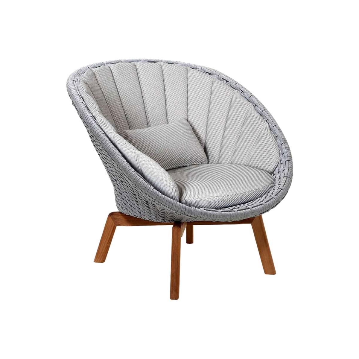 Design. The distinctively stunning and elegant Cane-line Peacock Light Grey Lounge Chair with Cushion Set will certainly. Make a statement in your. Glorious. Contemporary outdoor setting. The sophisticated, intelligent design is crafted from. Comfortable. Cane-line Soft Rope. ,. Suitable for any climate. , being both. Temperature and UV-resistant. The teak legs add an inviting, warm glow, then finished with a. Beautiful cushion set, available in a choice of different fabrics and colors. Explore the range and discover what configuration suits your. Style best.